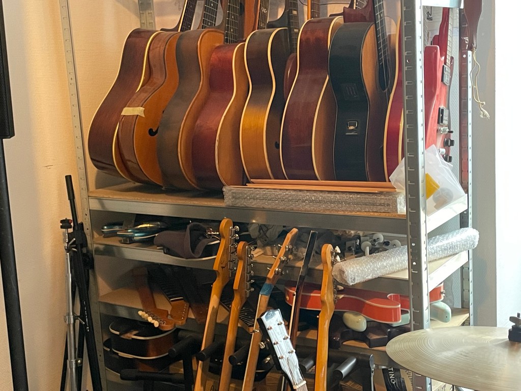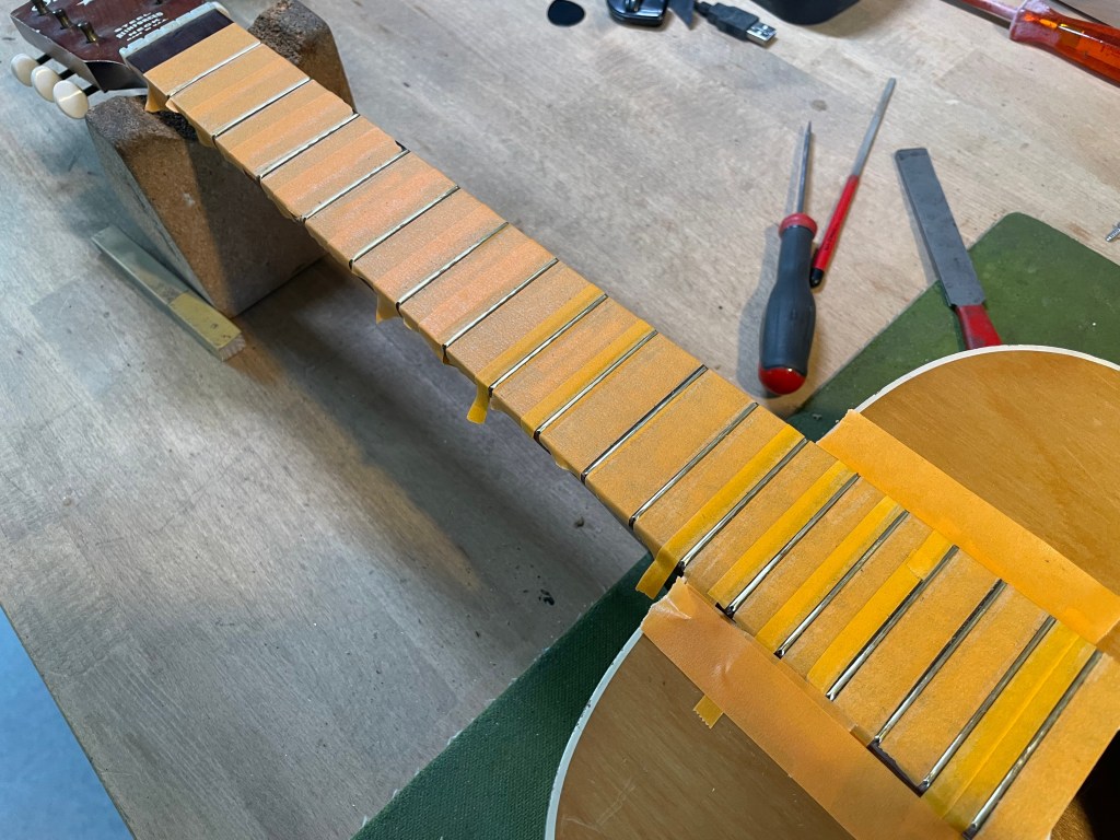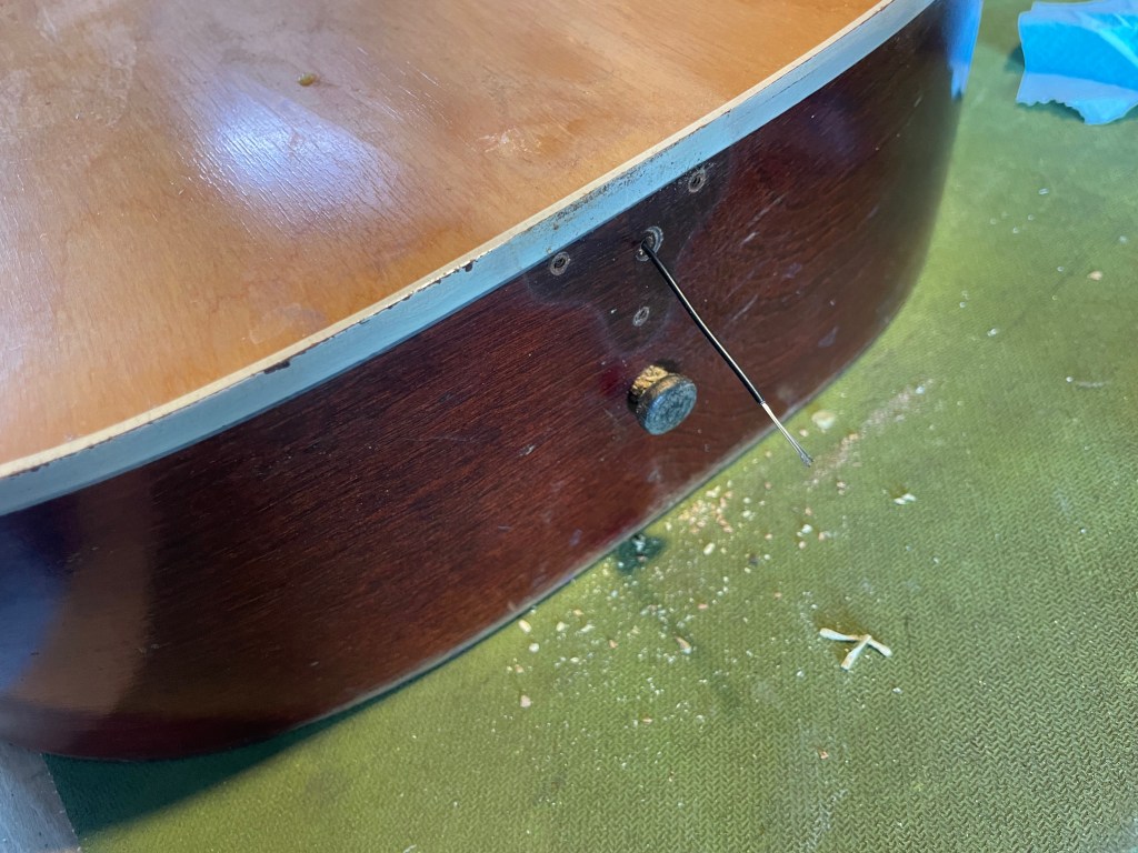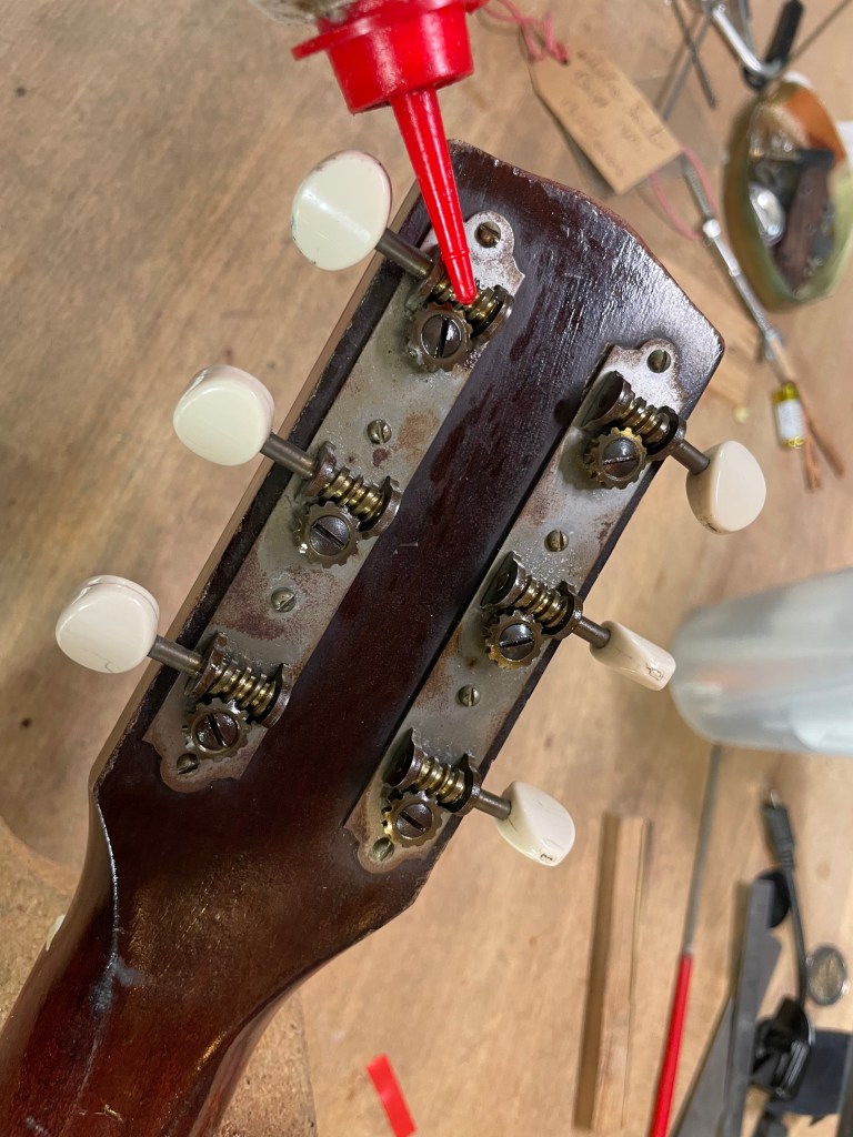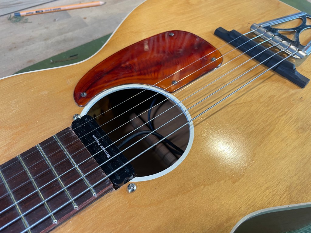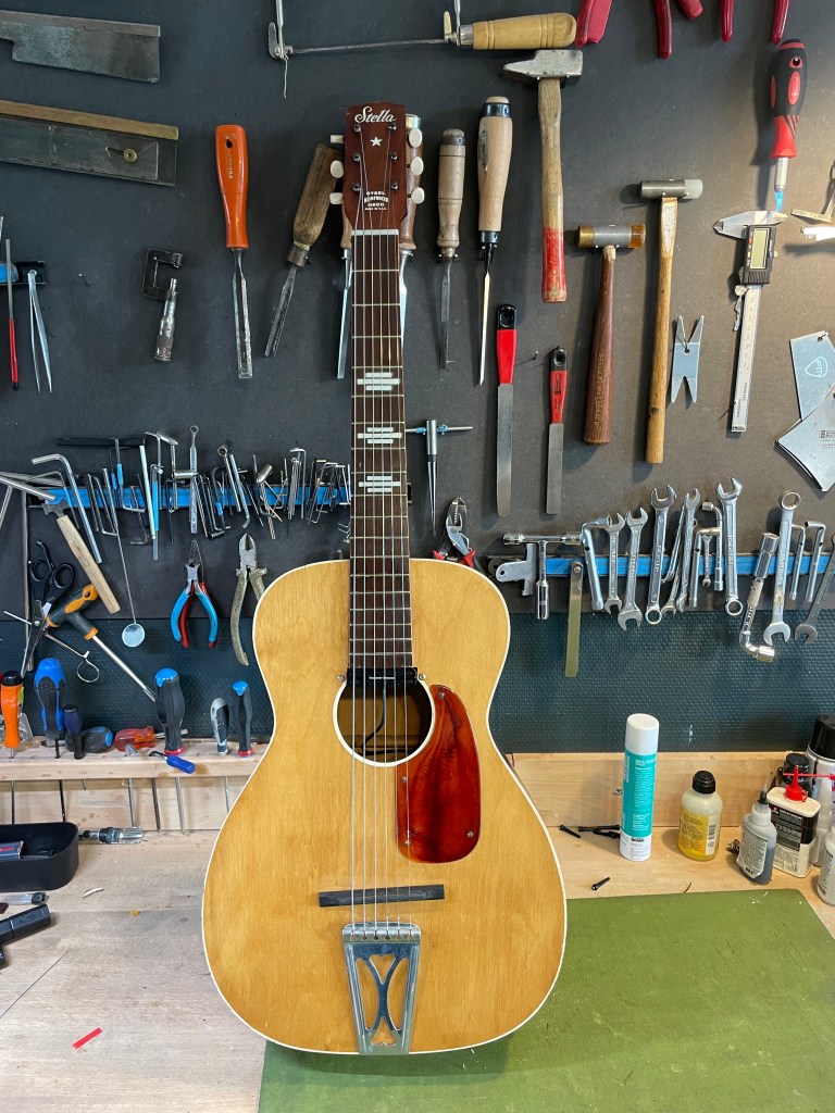 2 guitares des années 60, une Harmony H165 et une Stella Parlor sur la table d’opération.