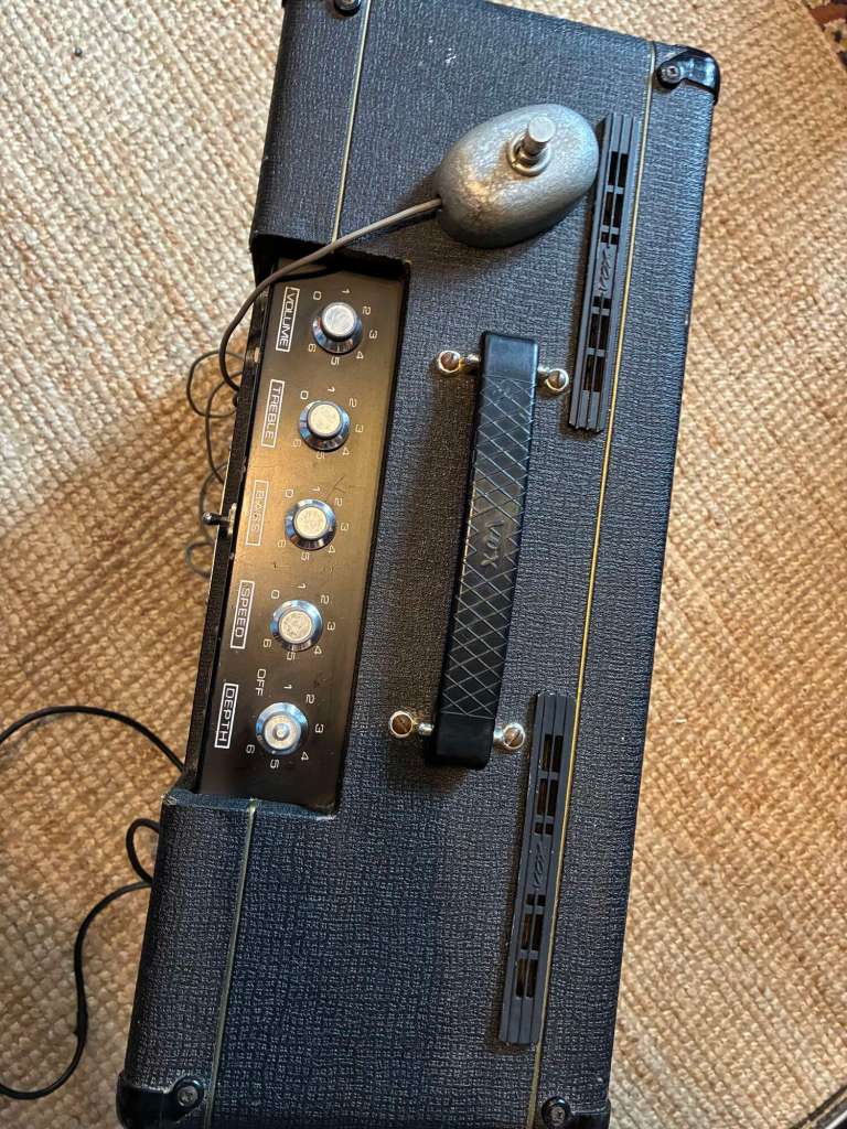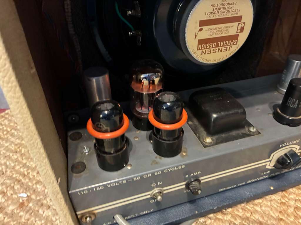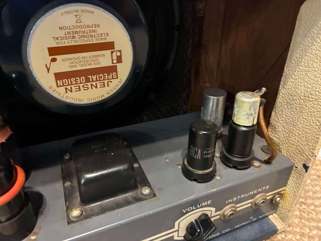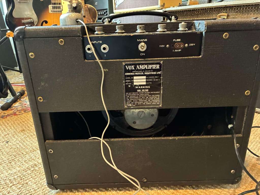 L’ampli a été entièrement révisé, le HP d’origine changé pour une jensen, celui d’origine a besoin d’être re membrané, il sera fourni avec pour l’histoire ou si vous voulez le remettre dans sa configuration d’origine, mais il fonctionne parfaitement ainsi!