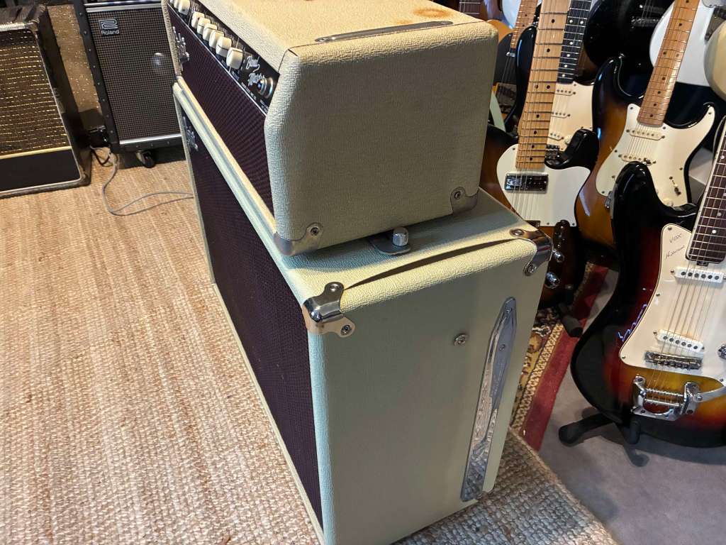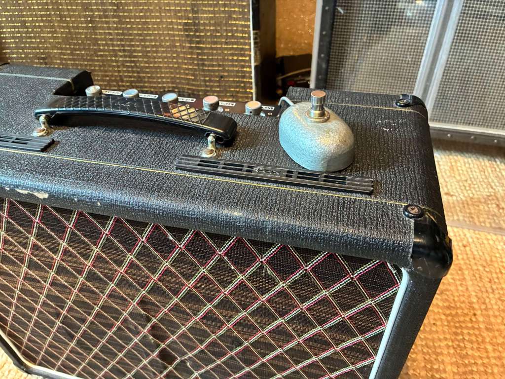 Période rêvée, 1961, la tête est en très bel état avec un jolie patine, ses condos Blue Molded, son circuit préservé, transfos d’origine, son trémolo, ampli américain 110V nécessitant un convertisseur 110/220.