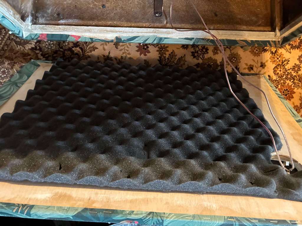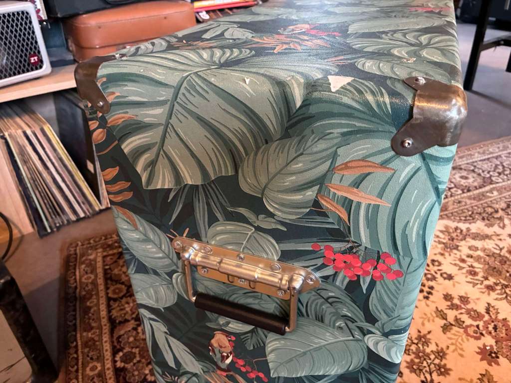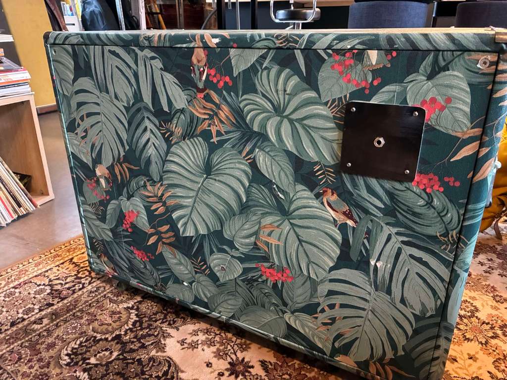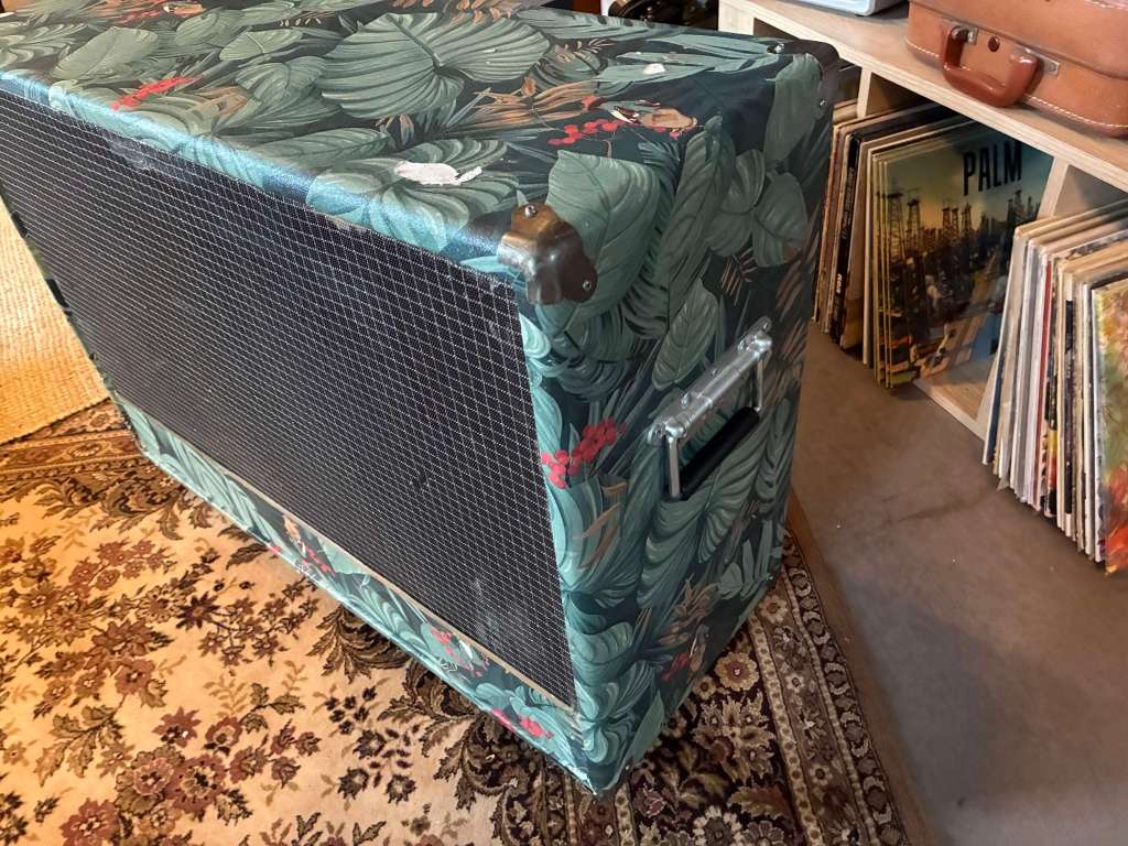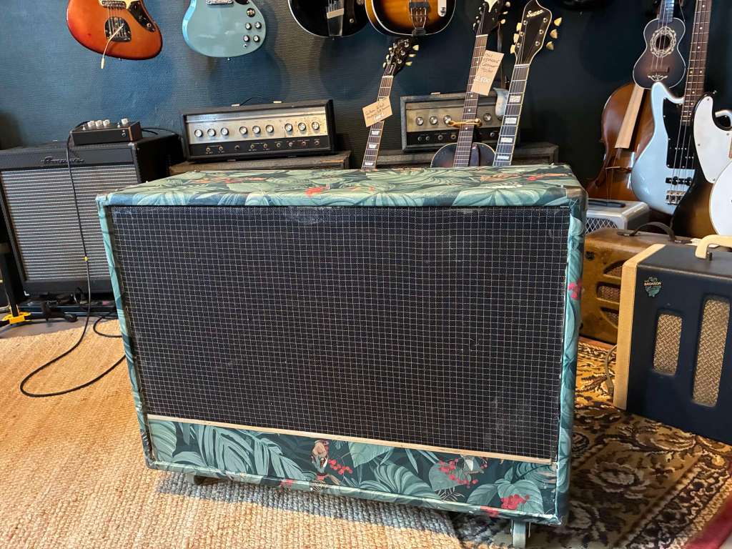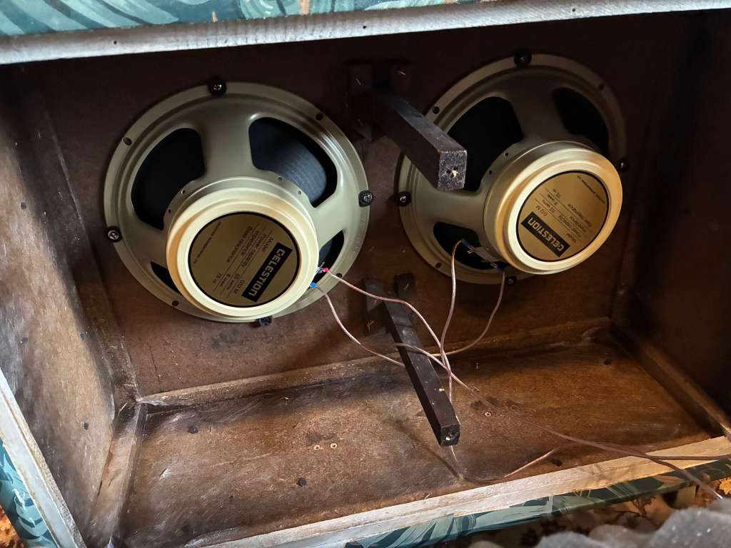 Il s’agit à la base d’un cabinet Eko datant des années 60/70, fermé, équipé des deux haut parleurs Celestion Cream back 12 pouces 65W 8ohm (+/-2 ans).
