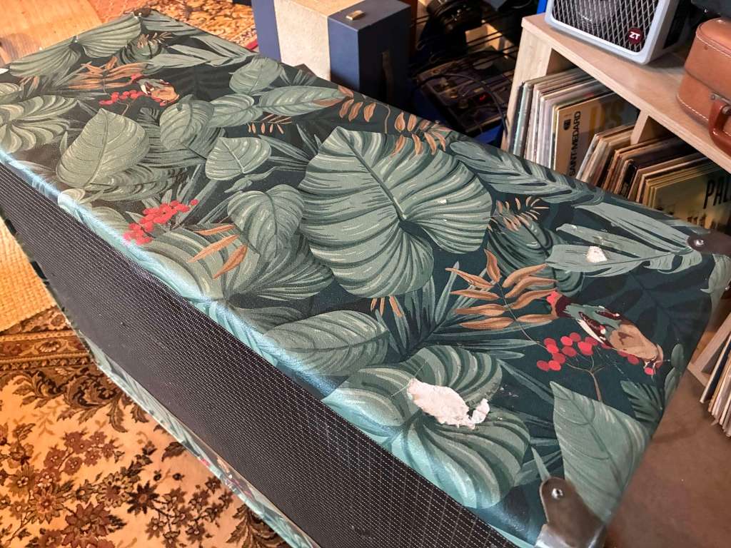 Comme vous le remarquerez, le HP est un Jensen recent qui lui va très très bien et le tolex et la poignée du cab ont été refaits, plus épais, bleu, très classe.
