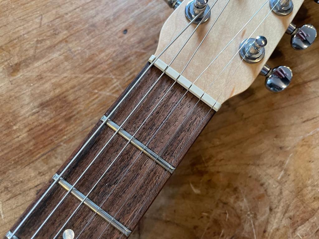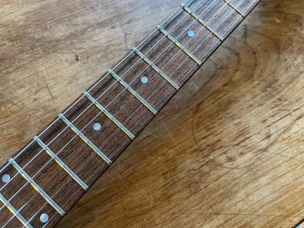 Il a été entièrement réglé à l’atelier, mécaniques nettoyées et lubrifiées, frettes polies et ajustées, manche réglé etc.