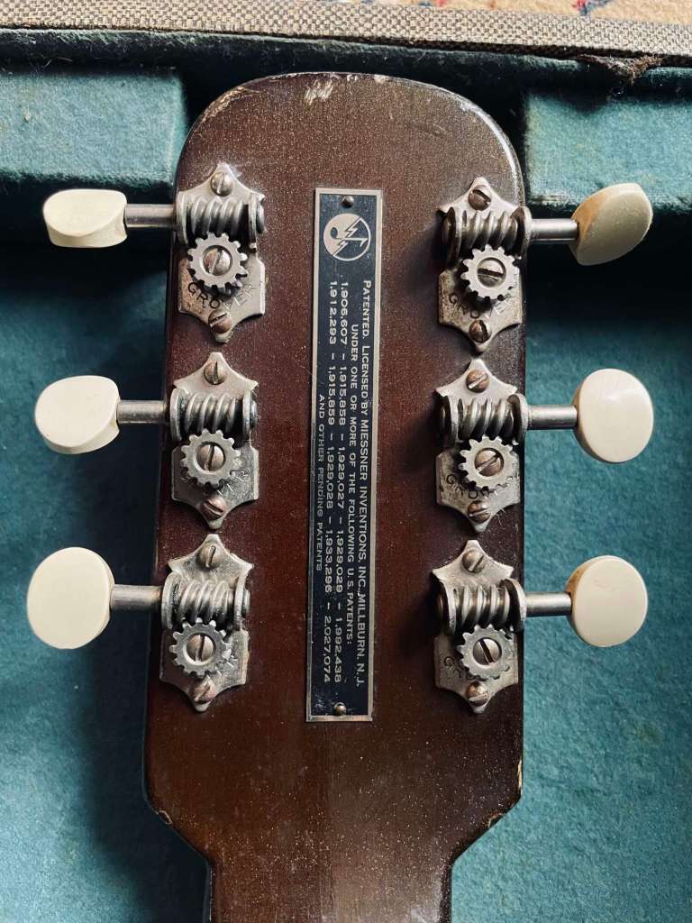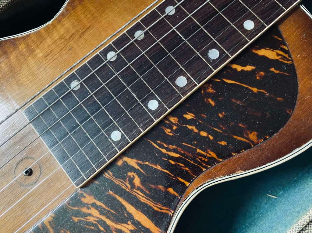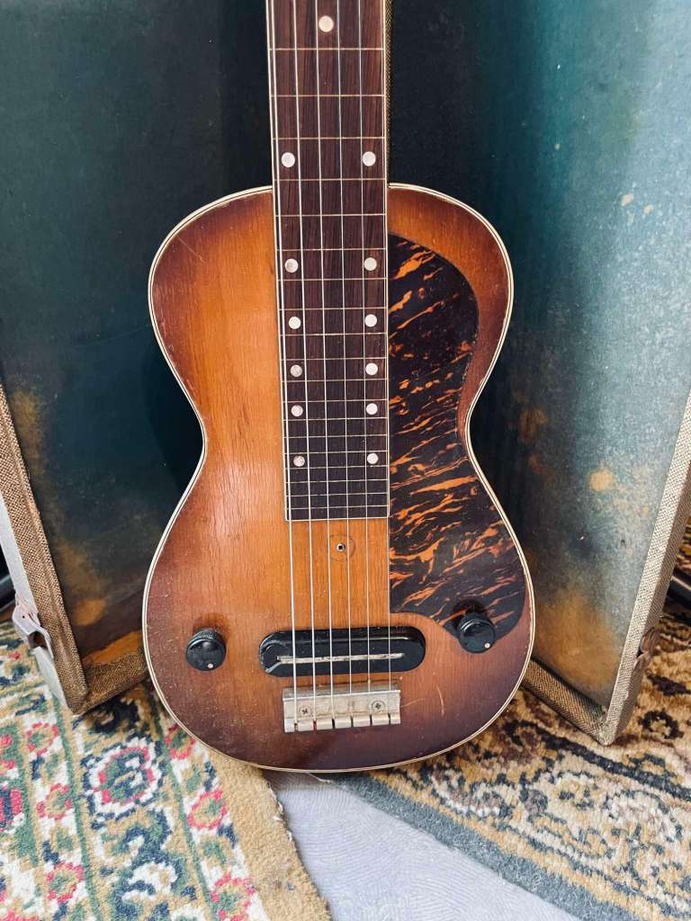 Véritable témoin d’une époque qui voyait apparaître les premiers instruments électriques, ce lapsteel est toujours en bel état et parfaitement fonctionnel, juste avec un petit bout de bakelite manquant sur le capot du micro mais sans incidence sur le son, qui est d’ailleurs puissant et vraiment bon!