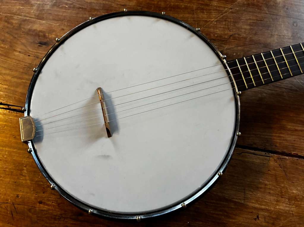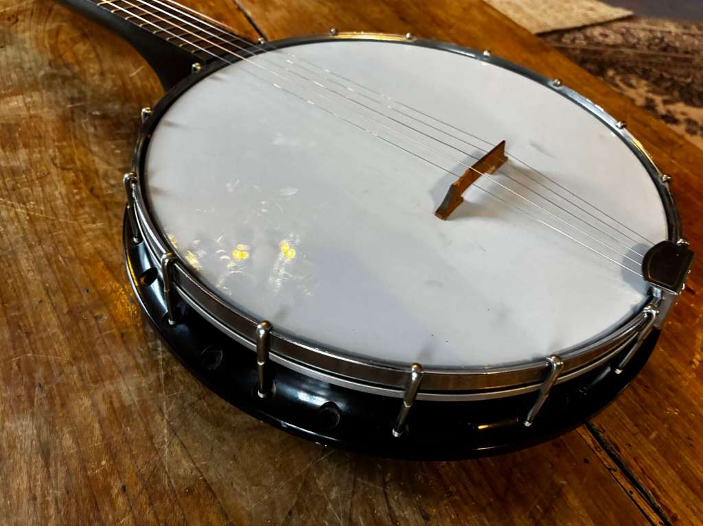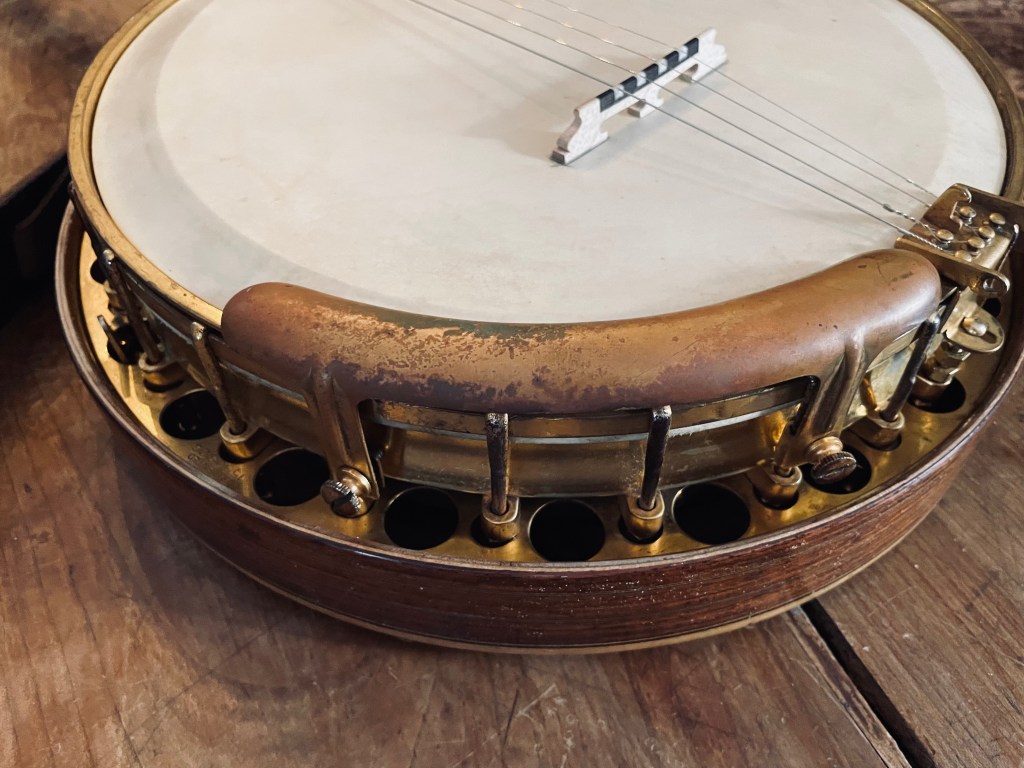 Son cercle est en métal, sa caisse en Bakélite, typique de ces banjos à l’époque.