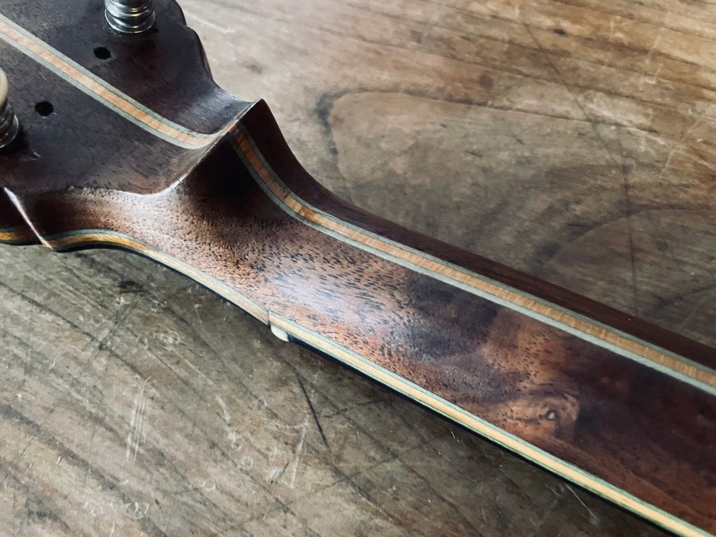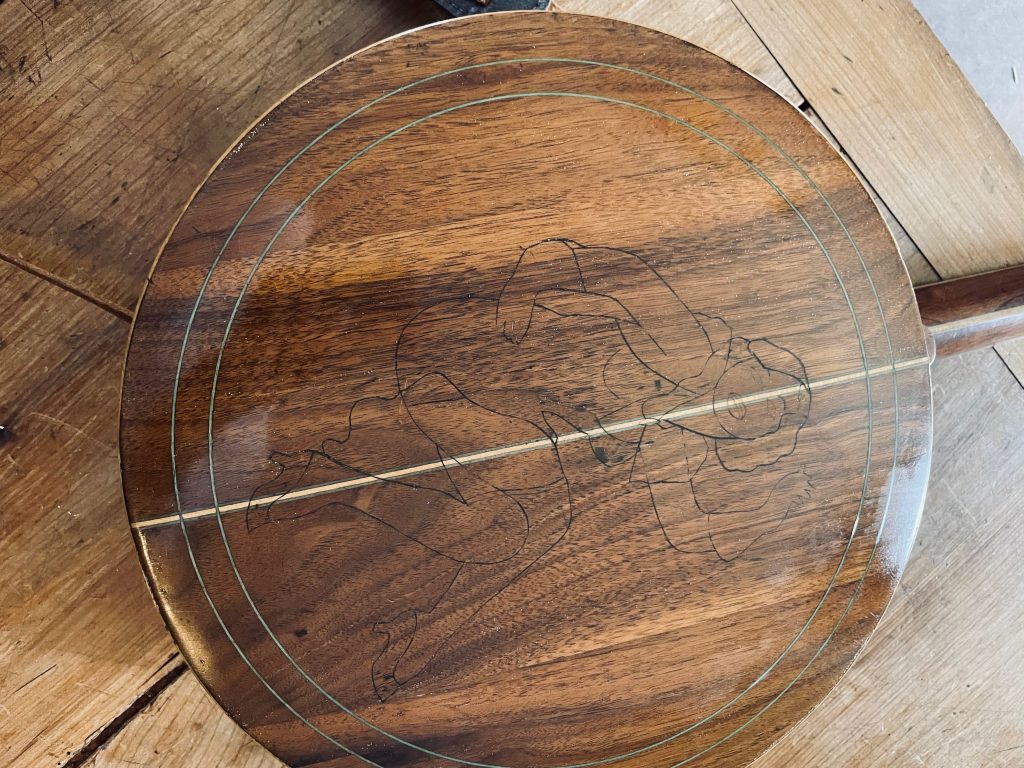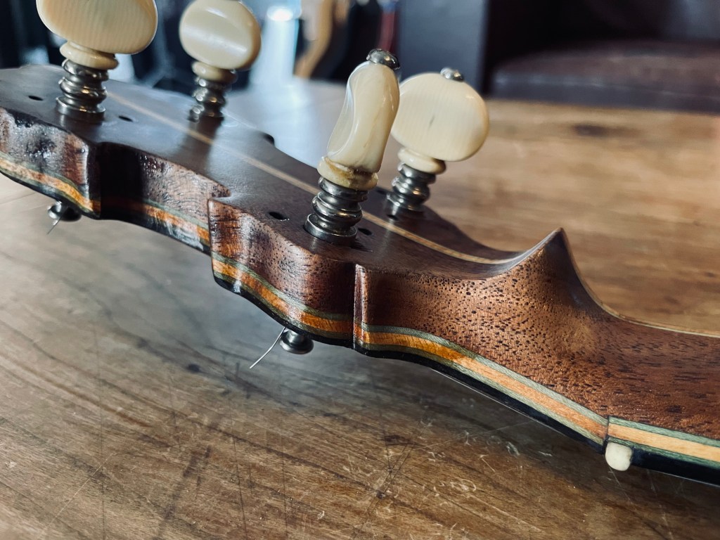 La lutherie est superbe , inserts bicolores le long du manche , tête sculptée, incrustations, bois sélectionnés, peau animale, resonateur avec une représentation féminine d’origine .