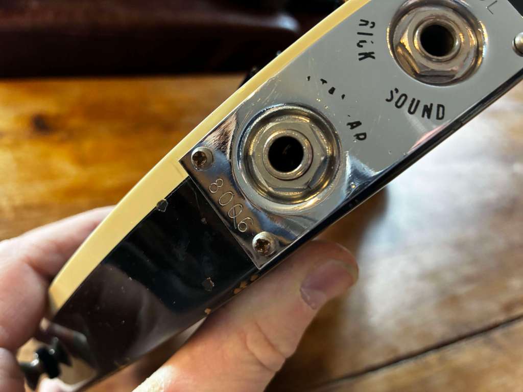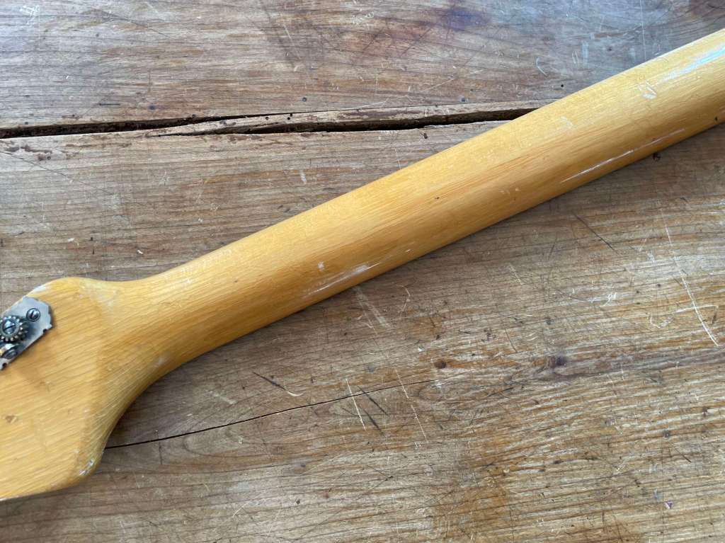 Corps et manche en érable, touche palissandre, 2 micros d’origine, la plaque blanche basse accueillant les potentiomètres est une repro. (Originale fournie)