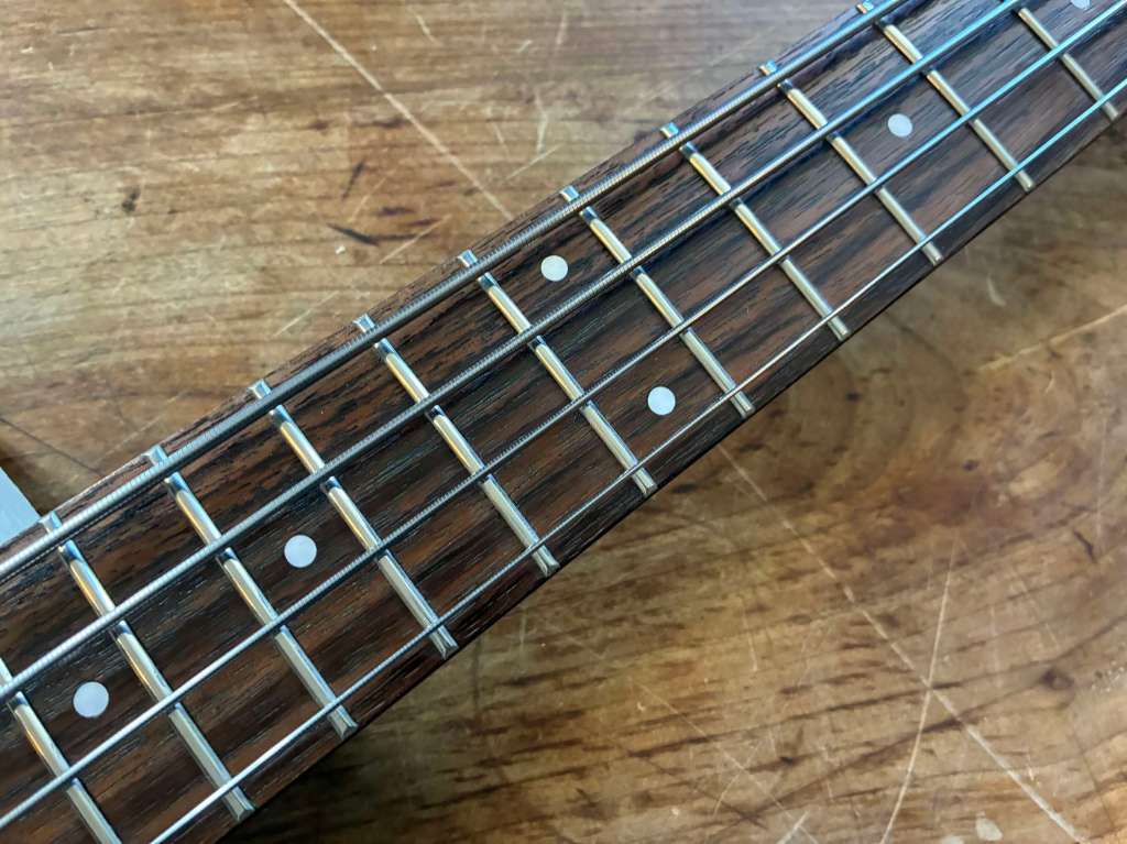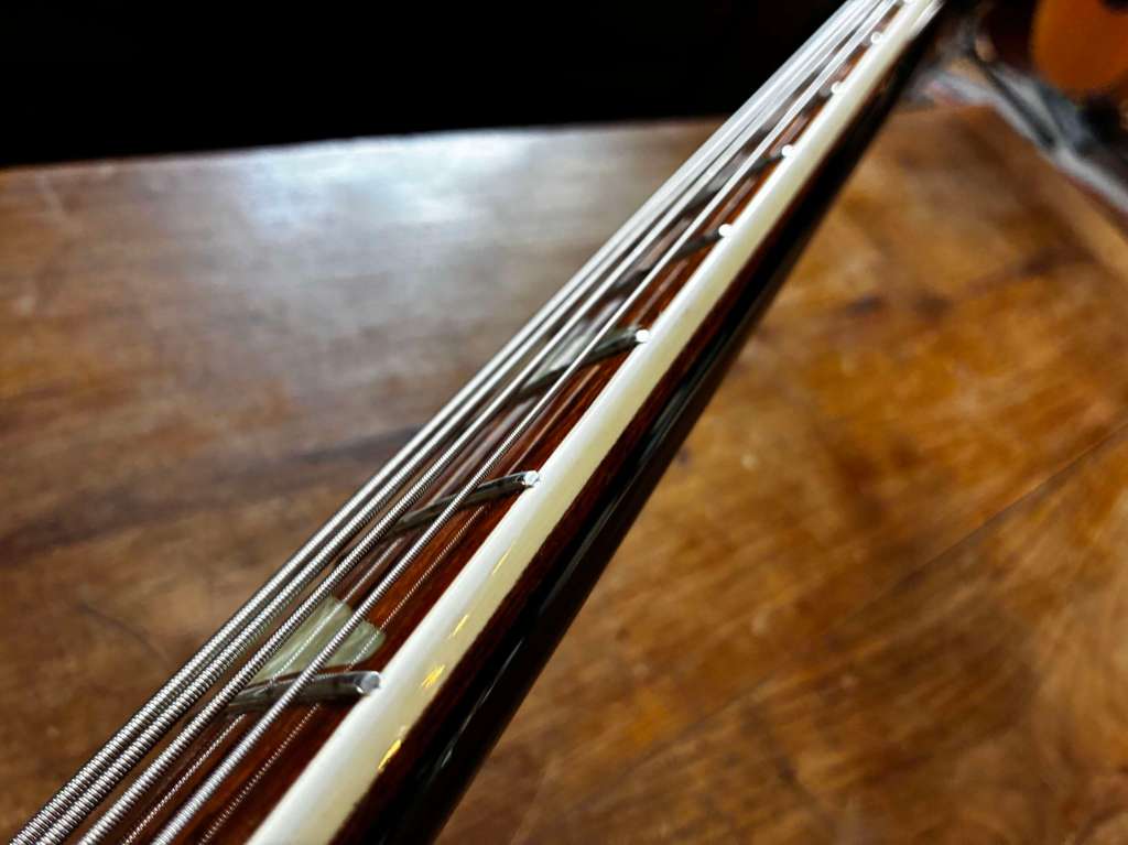 Le sillet de tête a été refait en os, elle a bénéficié d’un refrettage professionnel parfaitement réalisée sur la touche vernis, nickel.