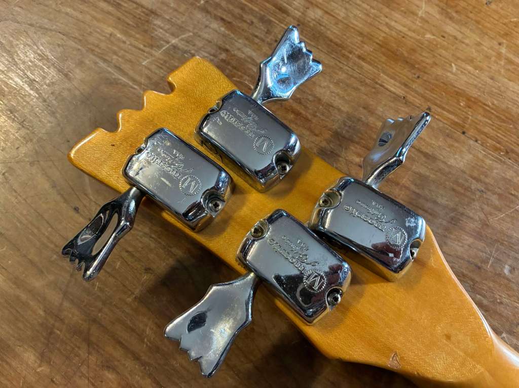 Voici une basse rare qui vient d’arriver à l’atelier, Mosrite Celebrity, made in USA Californie, 2 micros, manche fin et diapason de 25 pouces seulement !