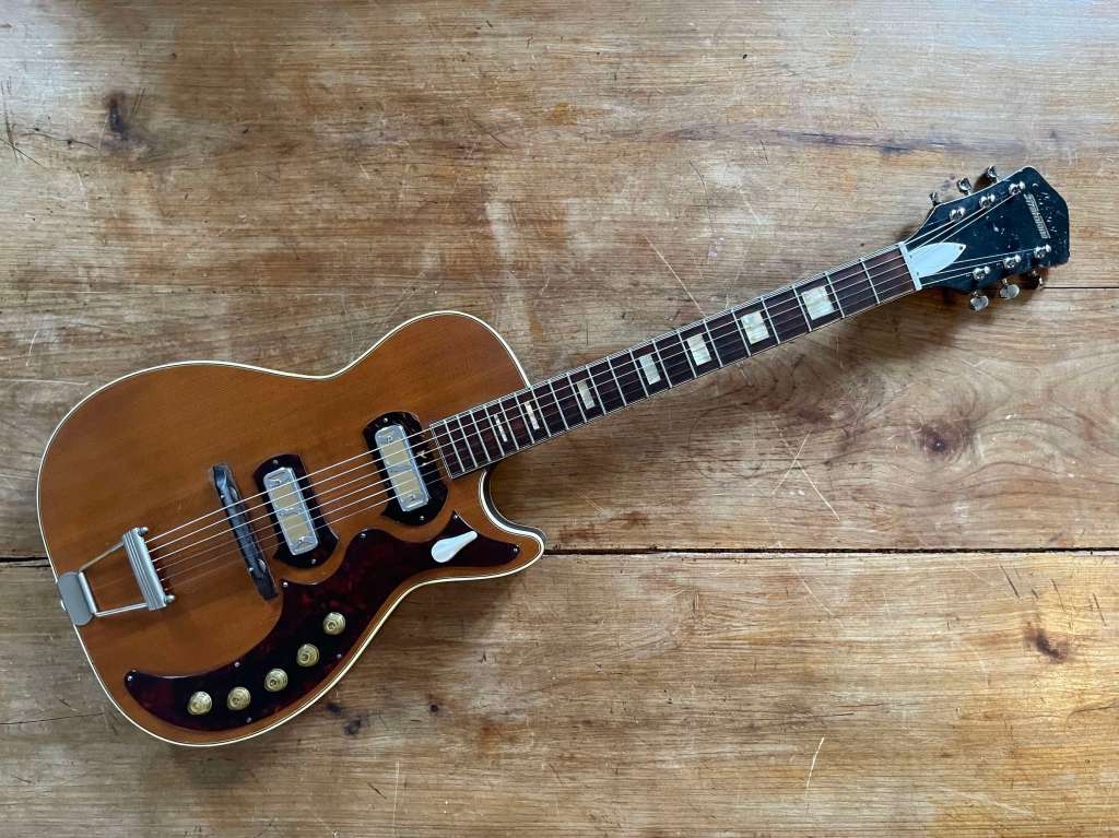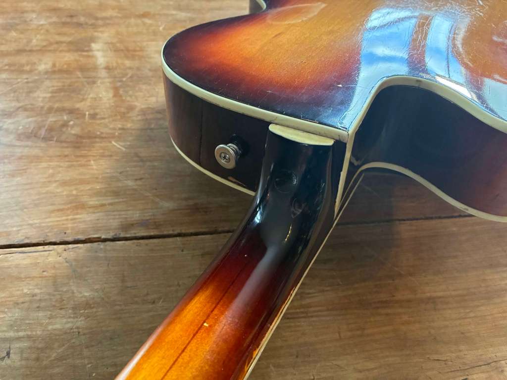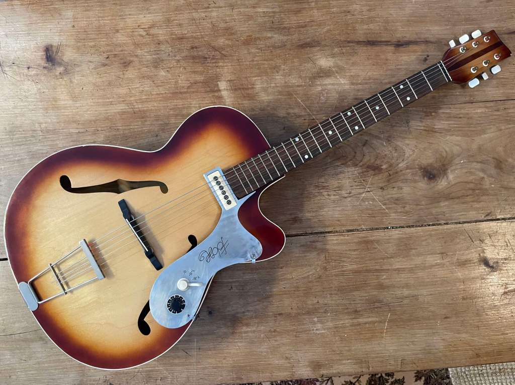 La Hofner Club est une guitare peu courante et réellement une petite bombe tout droit issue des années 60. Particulièrement destiné au marché anglais via le catalogue Selmer, cet exemplaire est en superbe état, restauré avec soin, et présente une jouabilité excellente.