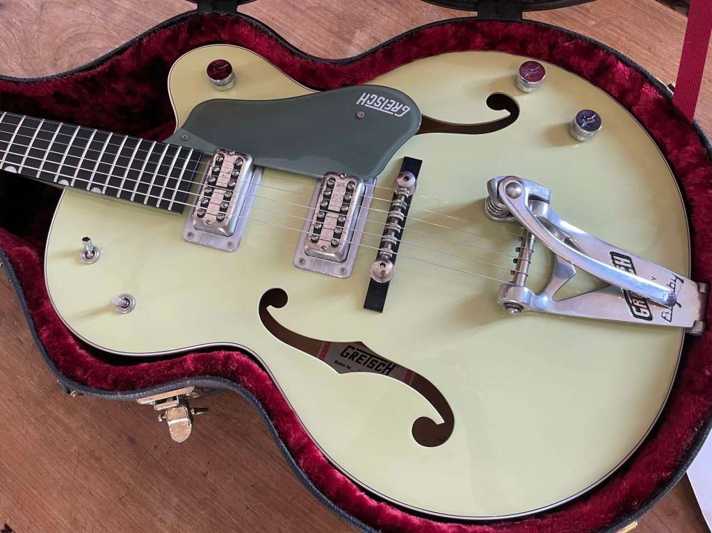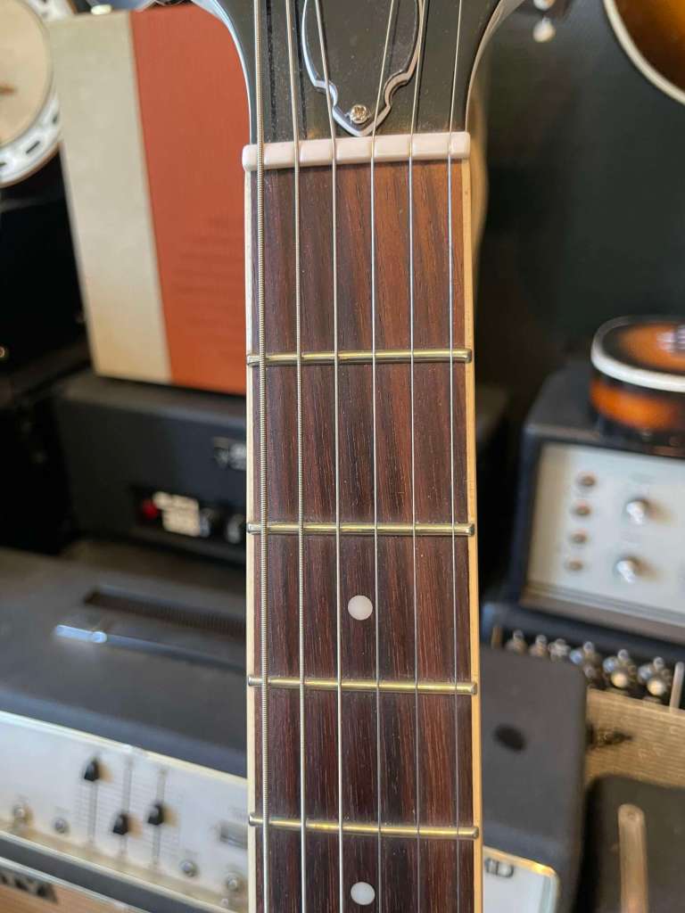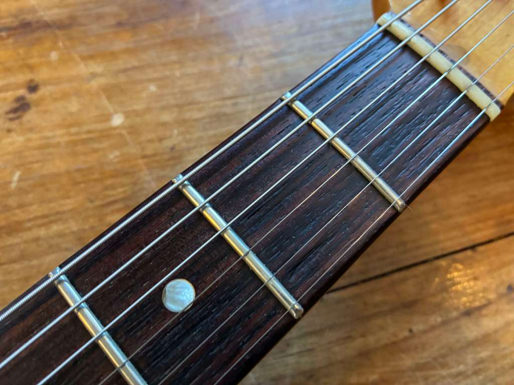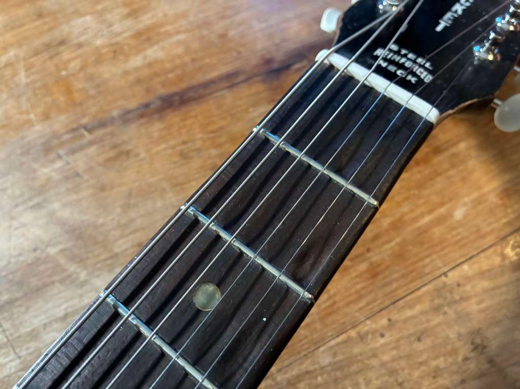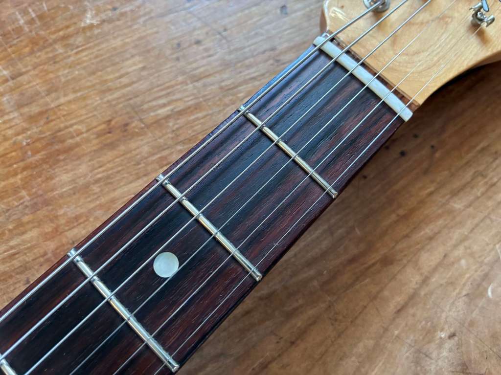 Le Bigsby est doux et musical, encore une fois la guitare est passée par l’atelier pour un réglage général, l’action est basse, le manche droit, les frettes en très bel état.