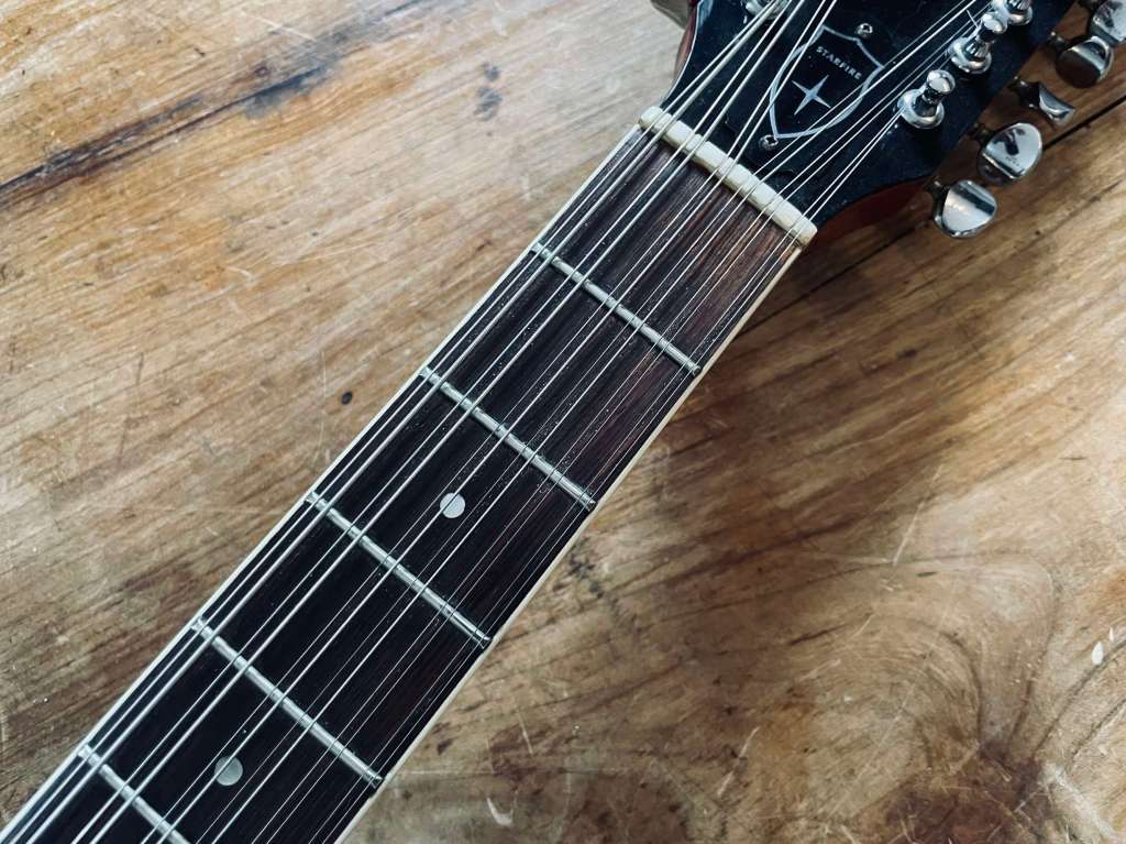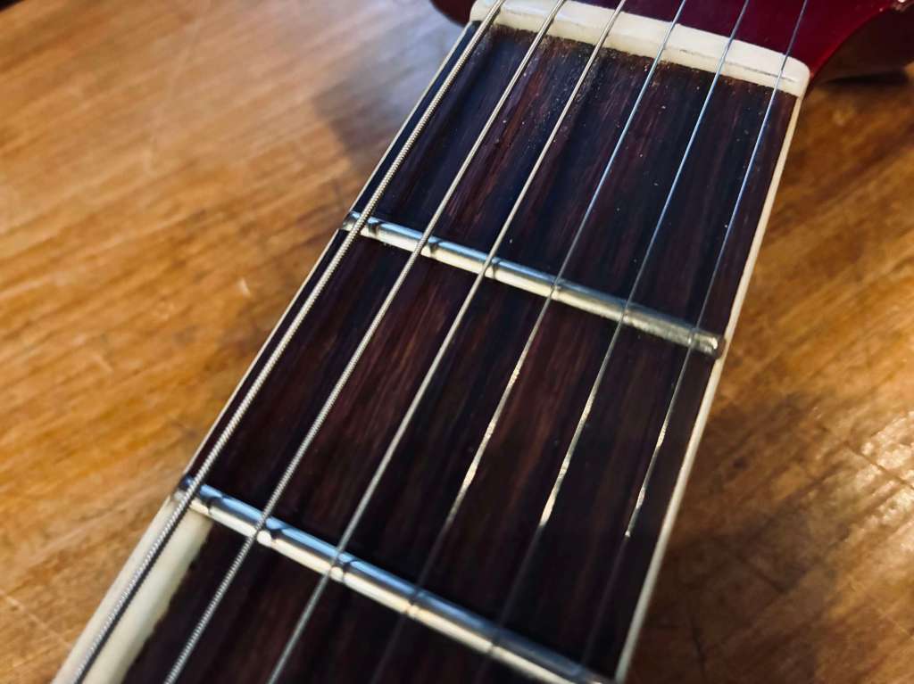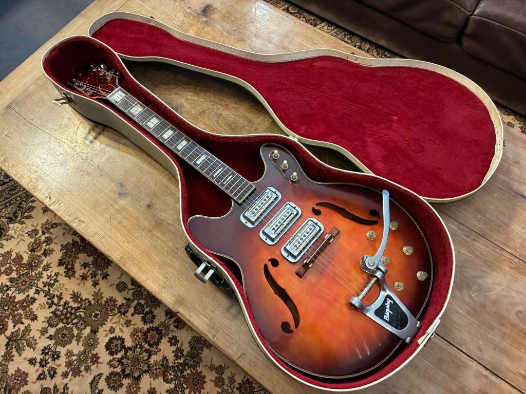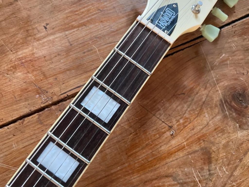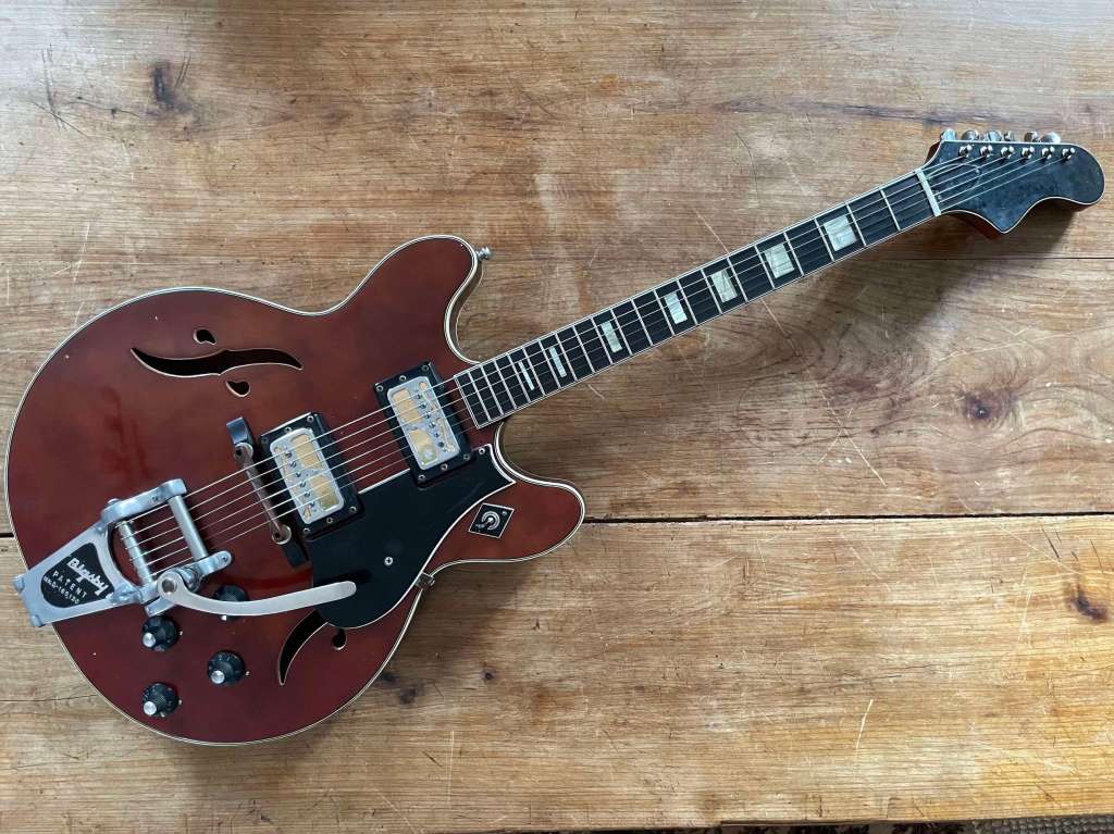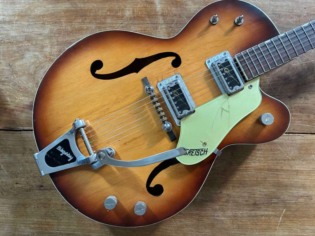 Le Bigsby est doux et musical, encore une fois la guitare est passée par l’atelier pour un réglage général, l’action est basse, le manche droit, les frettes en très bel état.