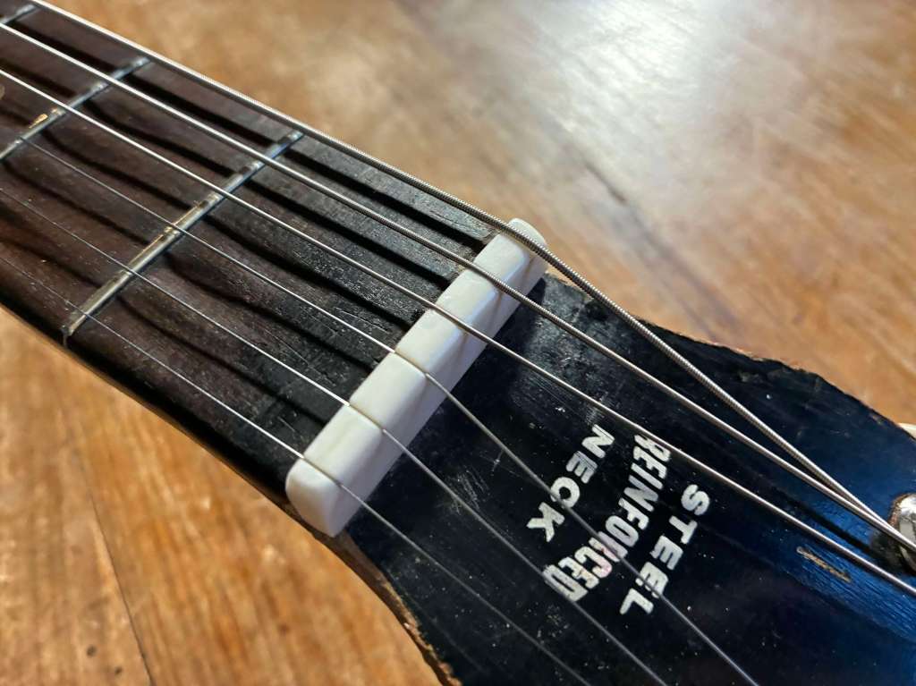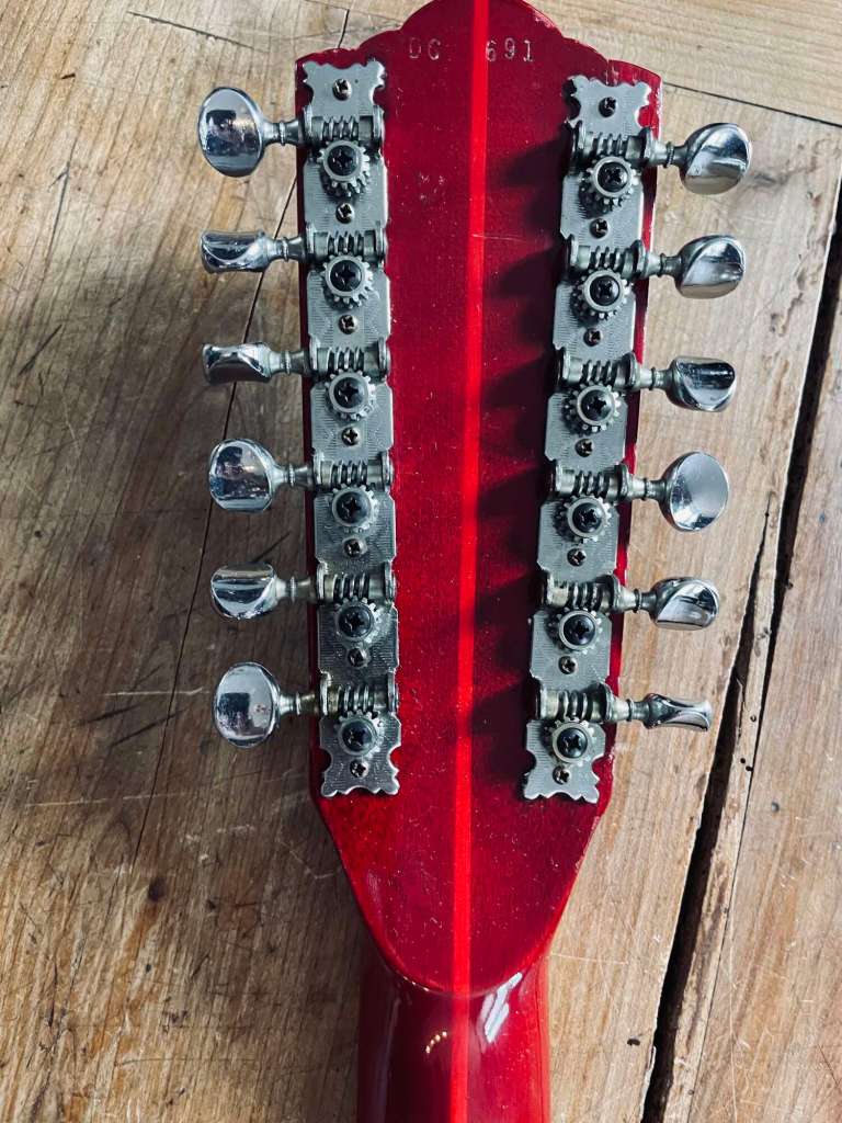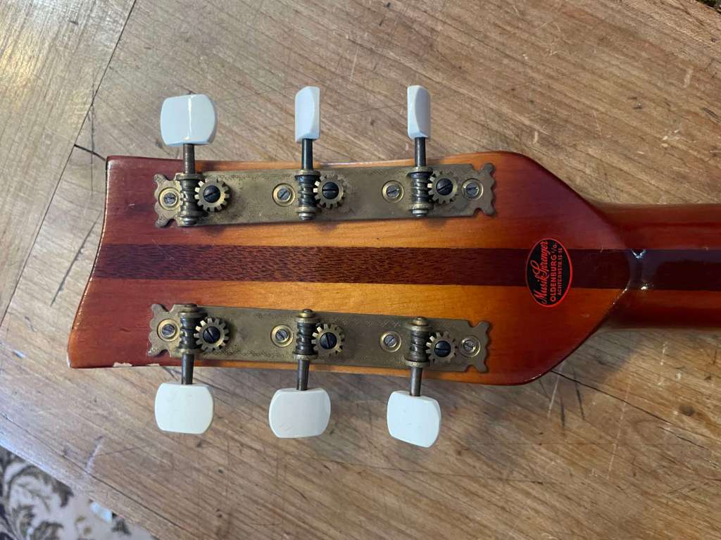 Elle est passée sur la table pour une remise en état et une optimisation, changement de mécaniques, nouveau sillet en os, planimétrie, installation d’un nouveau micro Dearmond moustache datant de la deuxième moitié des années 60. Plots réglables, niveau de sortie favorisant les harmoniques et le sustain, et sur une base métallique permettant un positionnement en hauteur parfait.