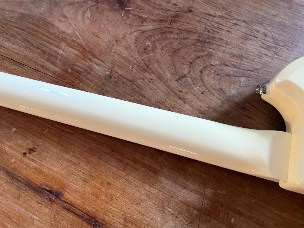 Rare à la vente, sa couleur Olympic White a commencé à jaunir magnifiquement, manche érable profil C ultra confort, les frettes sont nickelles, specs vintage, fines et radius 7,25.