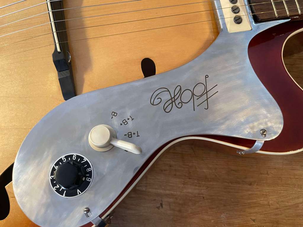 La petite plaque de pickguard positionnée sous le micro manche était absente et a été reproduite.