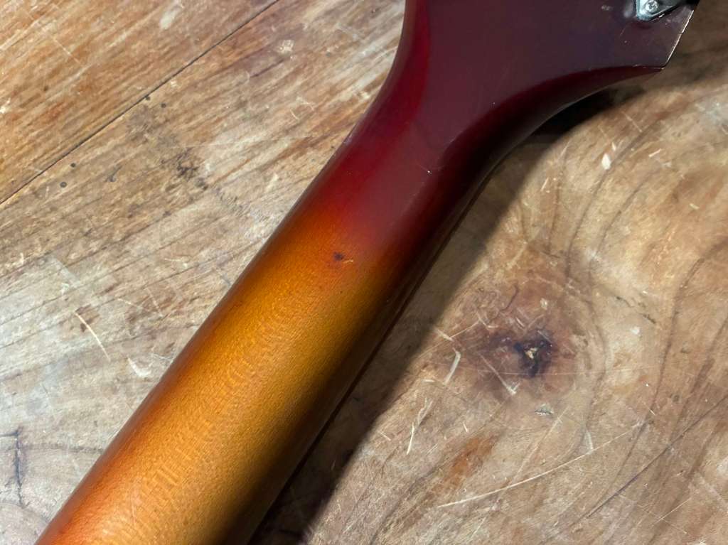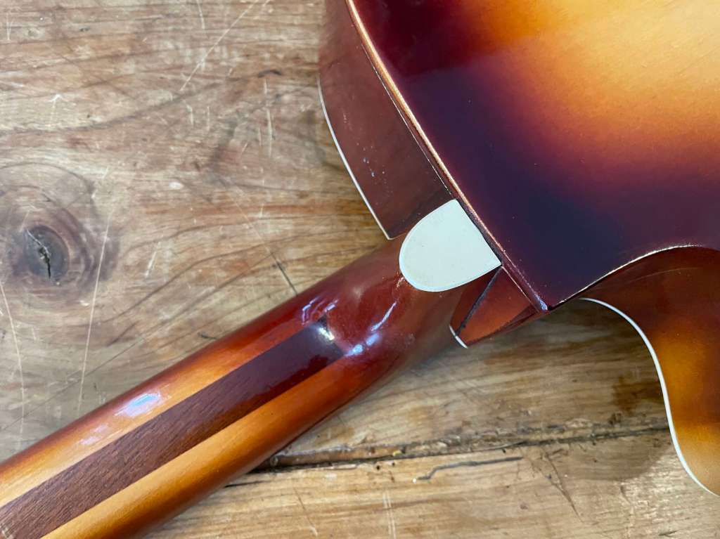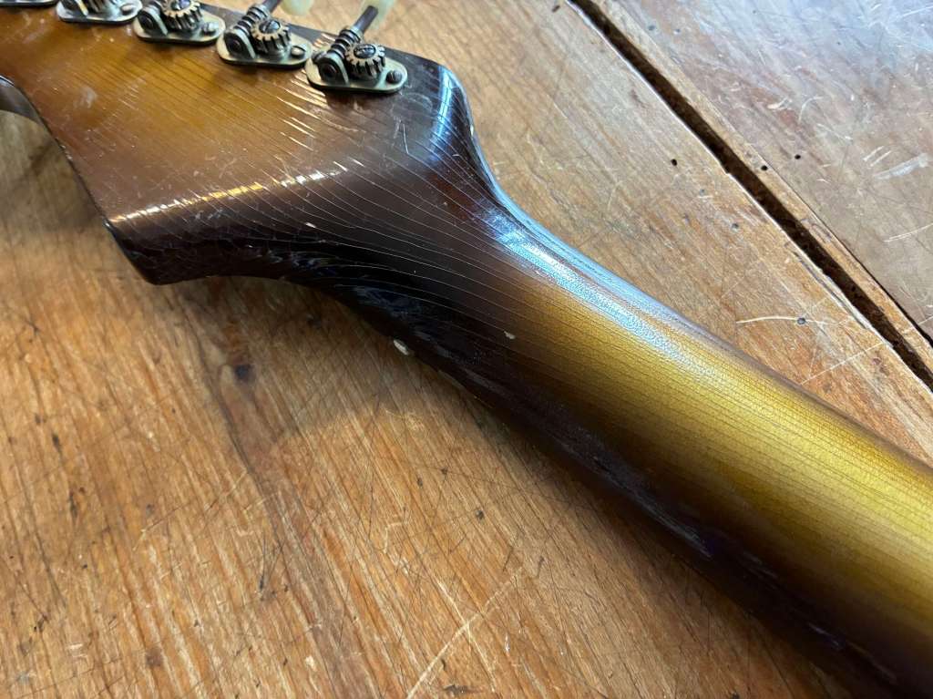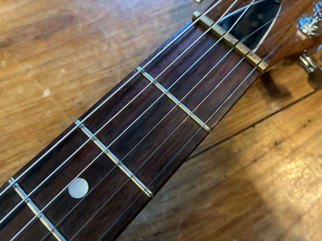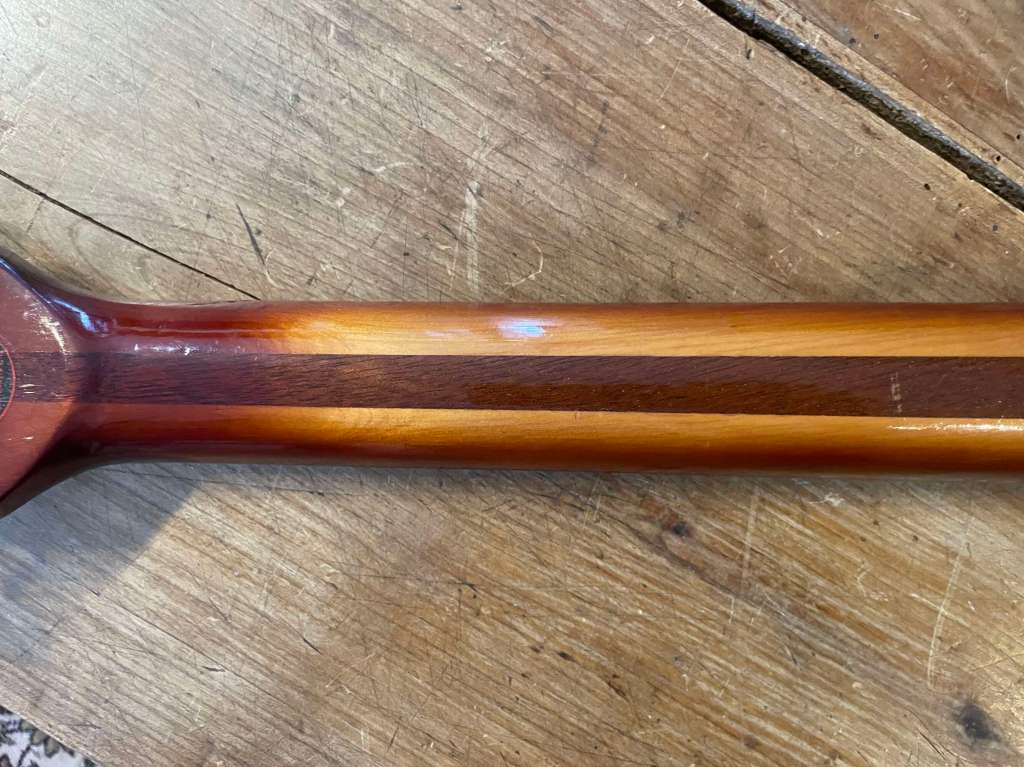 Le manche est le même que sur les électriques, profil C très facile à prendre en main, il est droit, frettes d’origine en très bon état.
