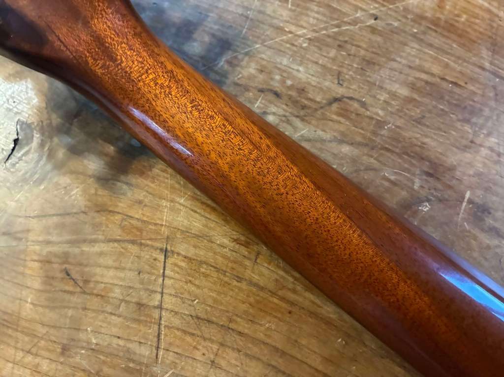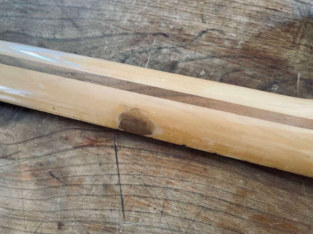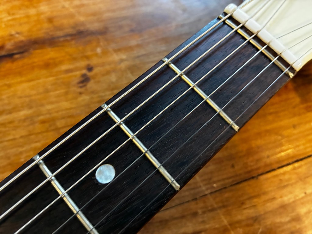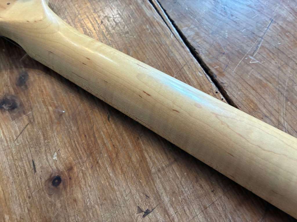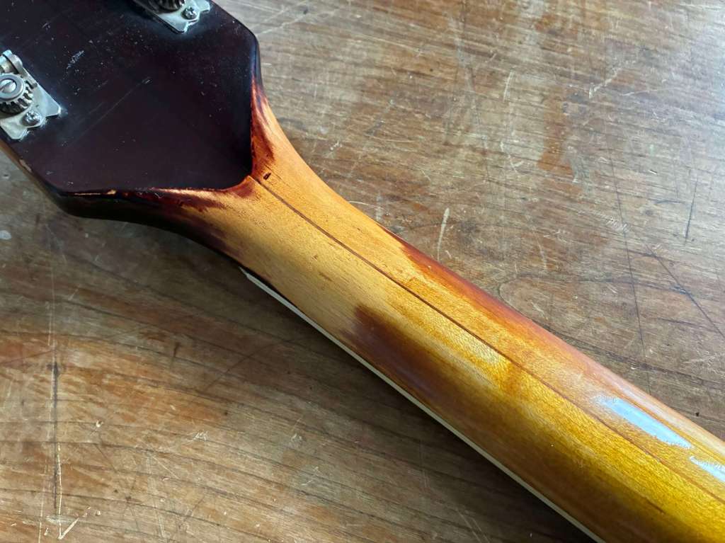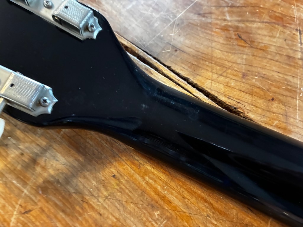 Le manche est le même que sur les électriques, profil C très facile à prendre en main, il est droit, frettes d’origine en très bon état.