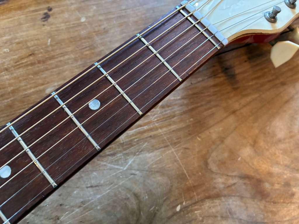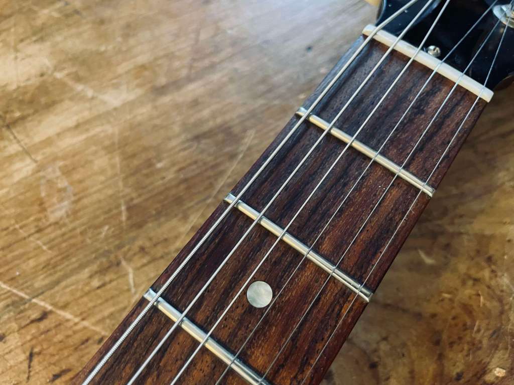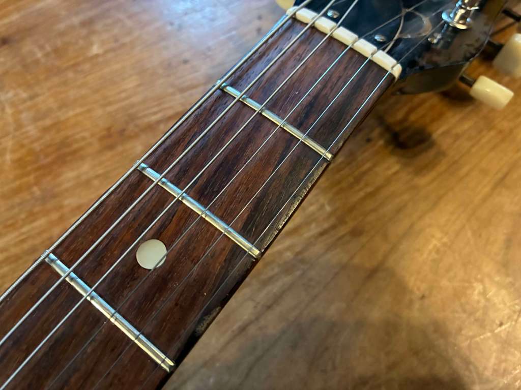 C’est une guitare qui a joué et c’est souvent très bon signe, elle est parfaitement saine, sonne et vibre comme il se doit, et sort de réglage !