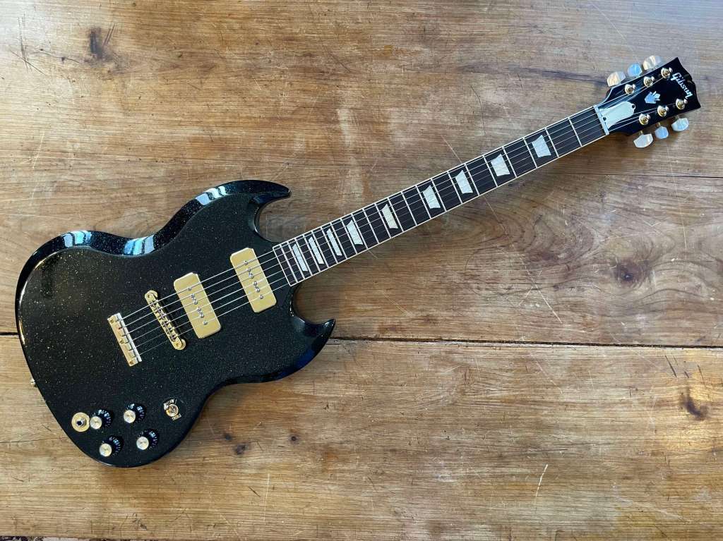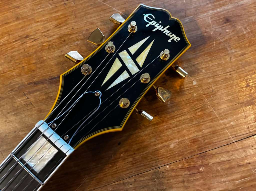 La touche est en ébène, frettes fines, manche ultra rapide et confortable, mécaniques impériales, binding gold pailleté, etc etc…