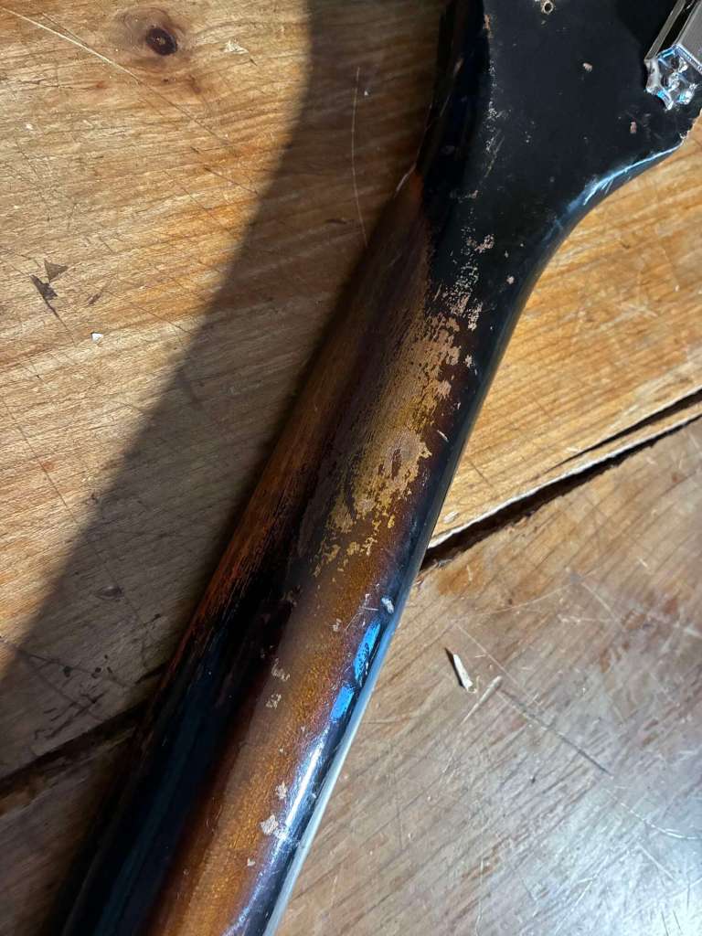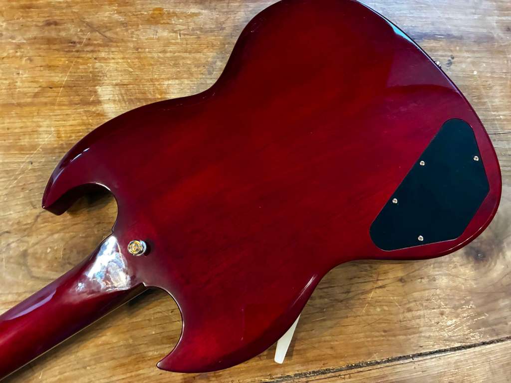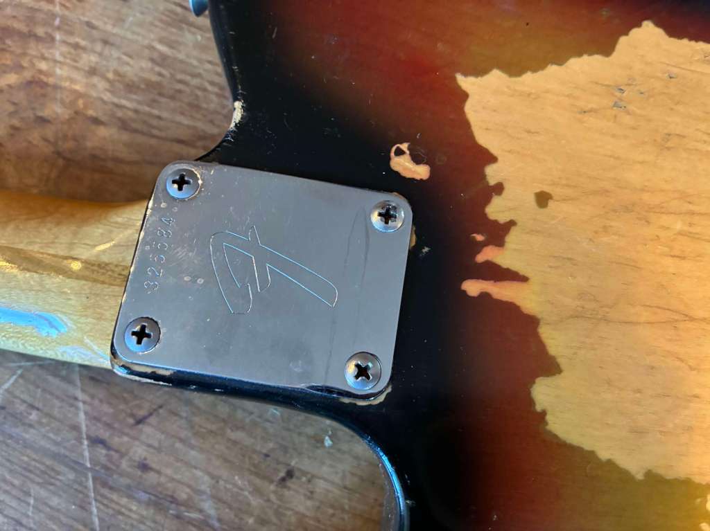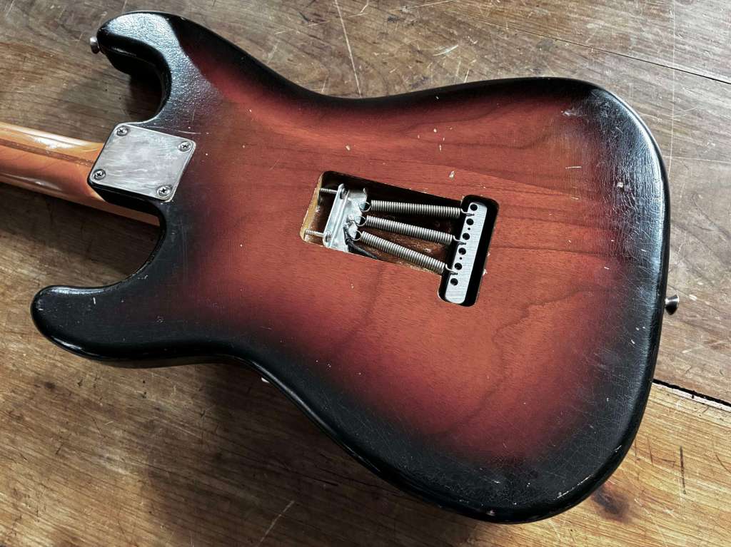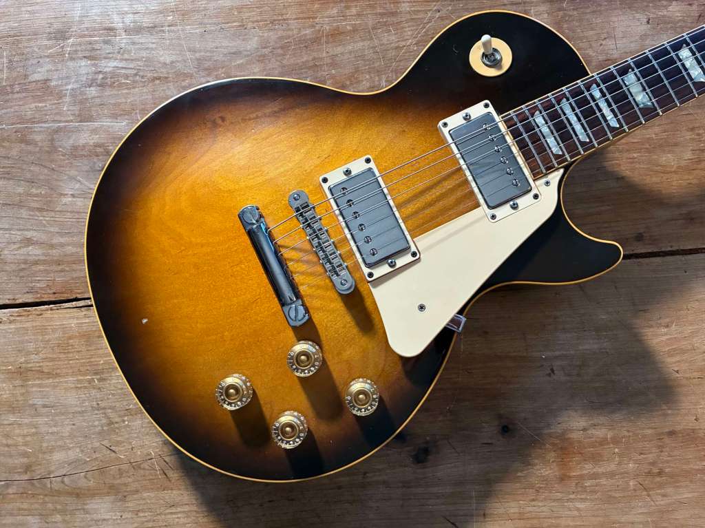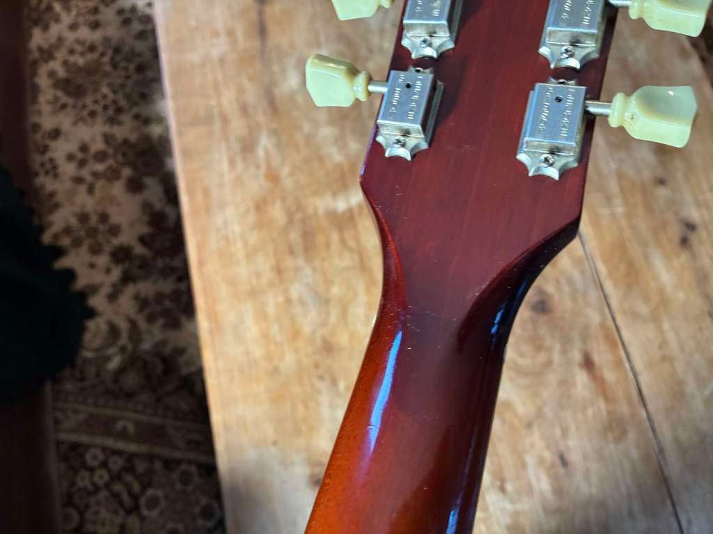3,39 kg sur la balance, fixation 4 points, un manche incroyable, très confortable, touche veneer en palissandre bien dark, finition sunburst patinée par des années de jeu.