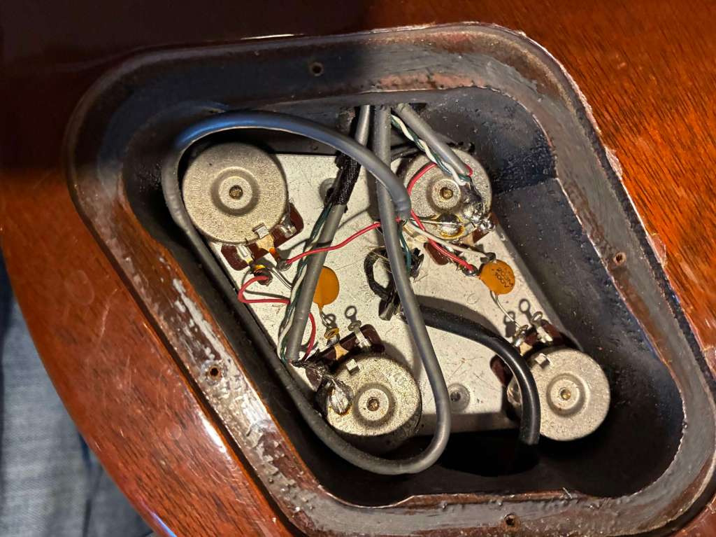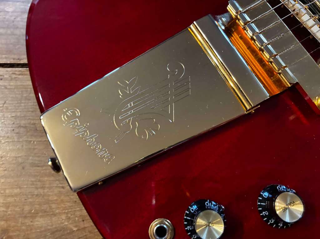 Elle a été refrettée il y a quelques années, frettes médium Jumbo en excellent état, micros d’origine mais volume et tone sont des CTS plus récents. Le pickguard sur les photos est un remplacement mais celui d’origine est fourni.