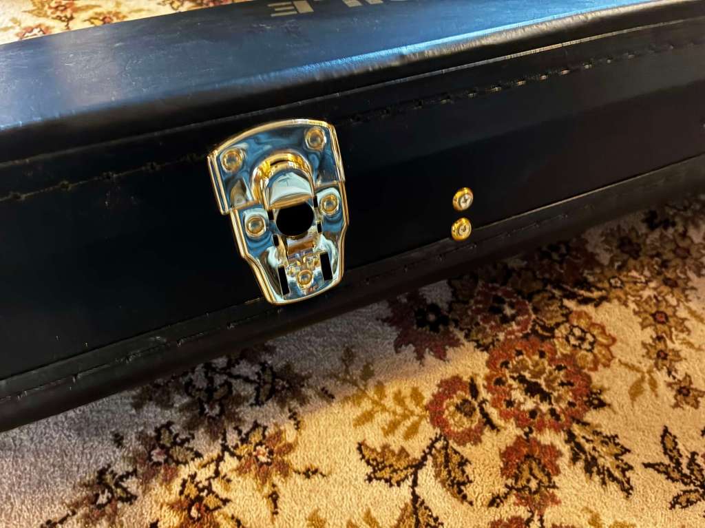 Elle arrive avec toute sa documentation d’époque et son étui, une prolongation du Chevalet en option pour ajuster l´intonation finement (idem réglage Floyd).