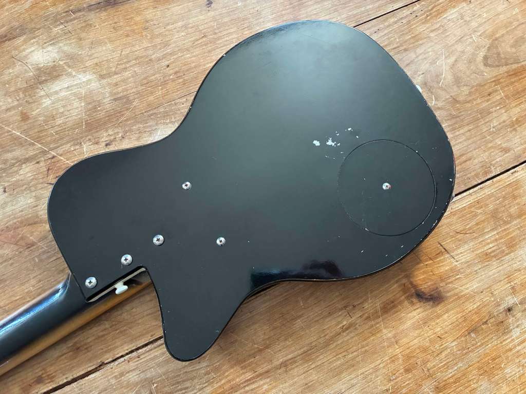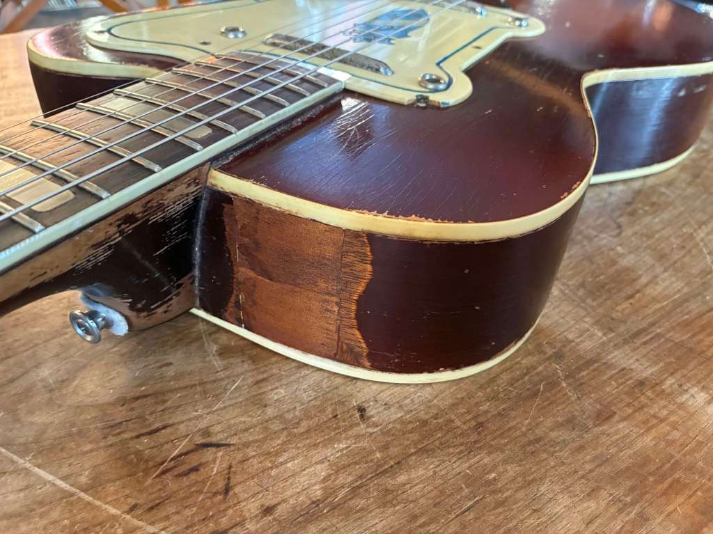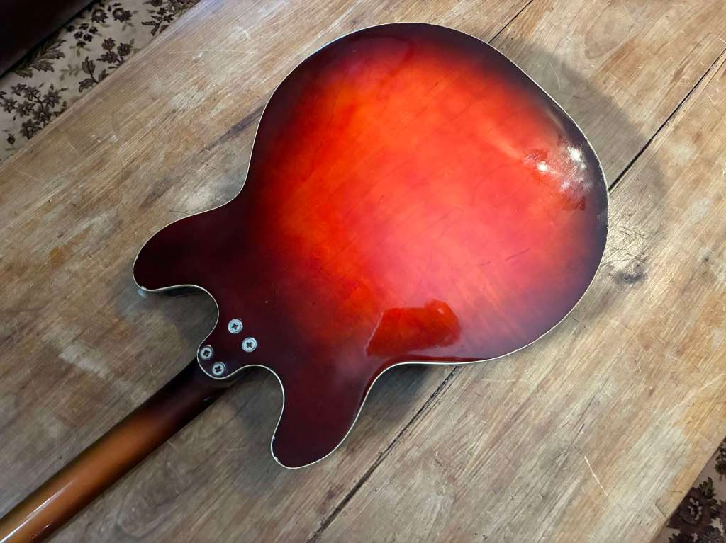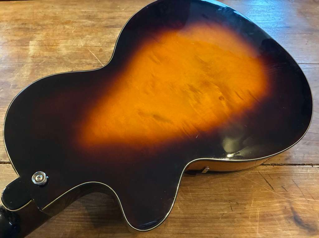Le corps assez compact mesure 13´ 1/2, finition sunburst superbe, la touche en en palissandre de Rio, tête avec le traditionnel logo « Bikini ».