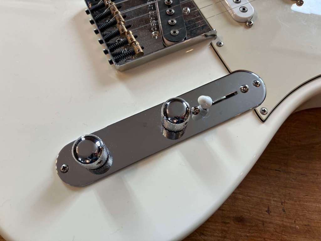 La guitare est réglée, manche très confortable, et quelques modifications ont été apportées comme un pickguard blanc /crème, de nouveaux boutons de potentiomètres, et un chevalet avec sillet en os pour optimiser le contact. Toutefois le chevalet d’origine est inclus