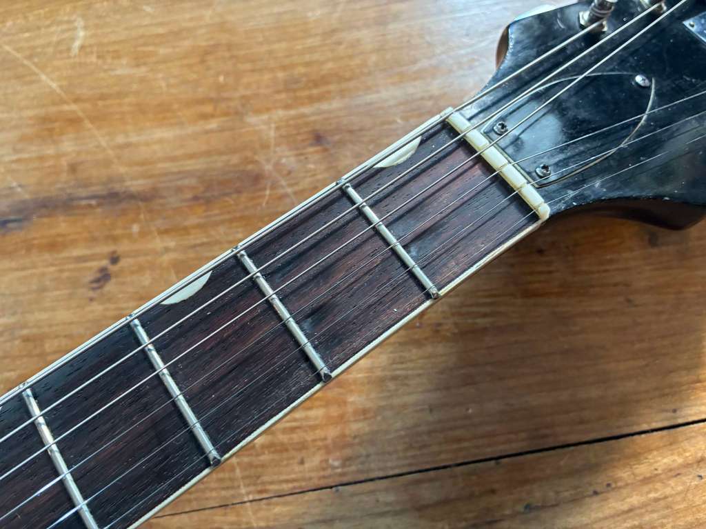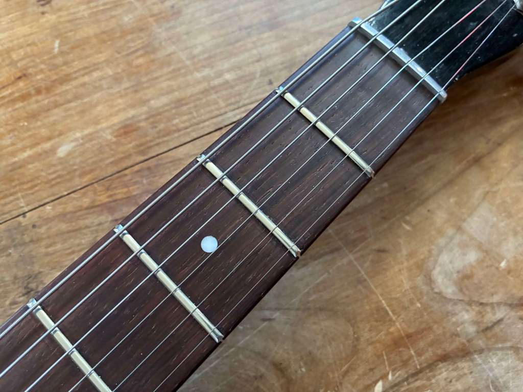 Elle a été restaurée avec soin et réglée pour un jeu fluide, nouveau sillet, nouvelles frettes, très agréable.