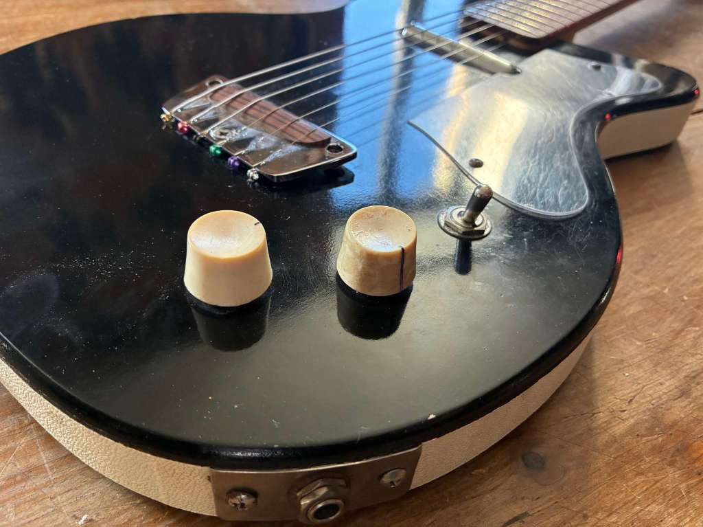 Cette guitare est arrivée en dépôt vente à l’atelier et a été entièrement restaurée par l’atelier Tupelo, et le micro par Nicolas Mercadal de chez Benedetti.