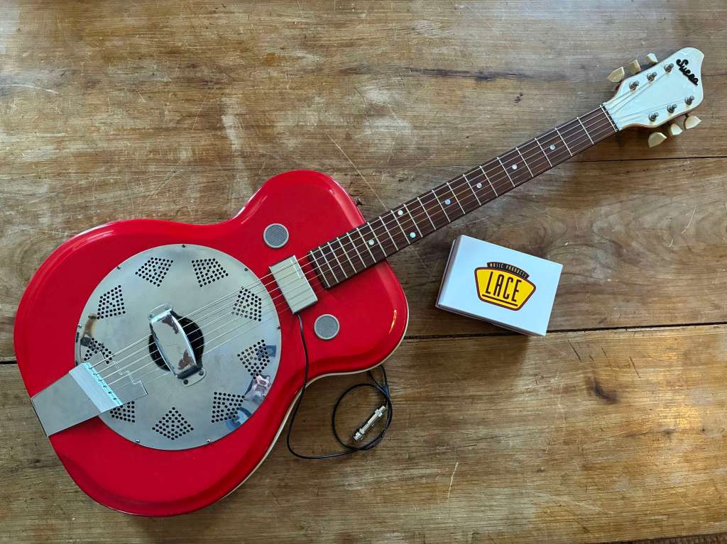 Elle sort de réglage / verif pour s’assurer que tout roule, et comme on a toujours envie d’électrifier ce genre de guitare je fourni avec un excellent micro magnétique Lace Sensor prévu spécifiquement pour les fréquences et l’installation non pérenne les guitares à résonateur.
