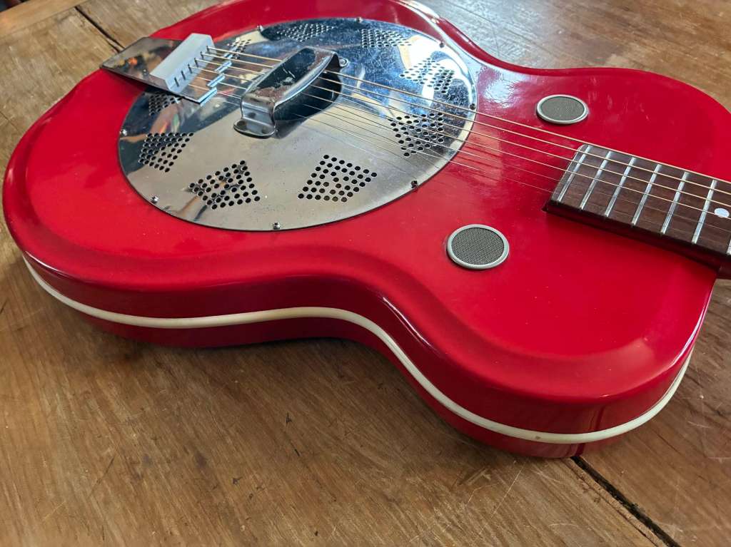 ⚡️1964/68 Supro Folkstar Res O Glass- pickup ⚡️. Made in USA, réalisation par Valco comme toutes les Suoro, National etc .. mais là on est bien sûr une guitare en Res’O Glass, coque en fibre de verre, légèrement plus épaisse que les modèles électriques, légère, et équipée d’un cône de résonateur !
